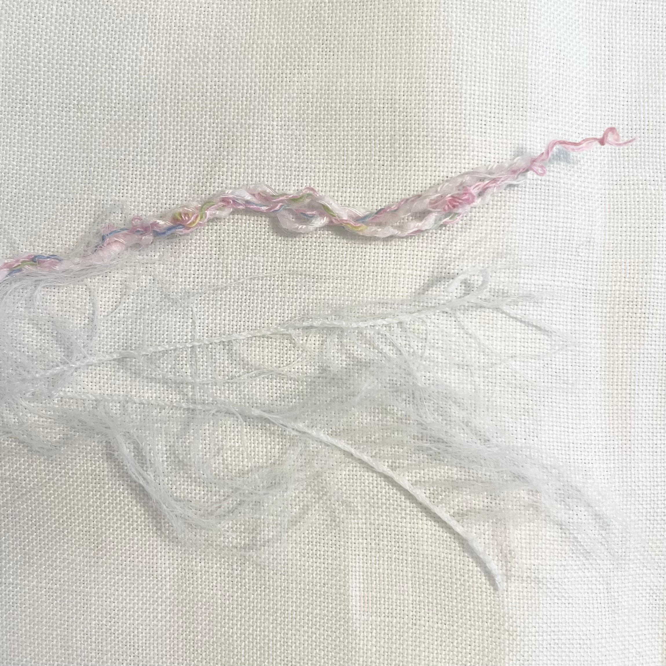 ①ピンクベースのカラフルなコットンヤーン②ホワイトの2本取りファーヤーンの計3本を引き揃えてます♪
