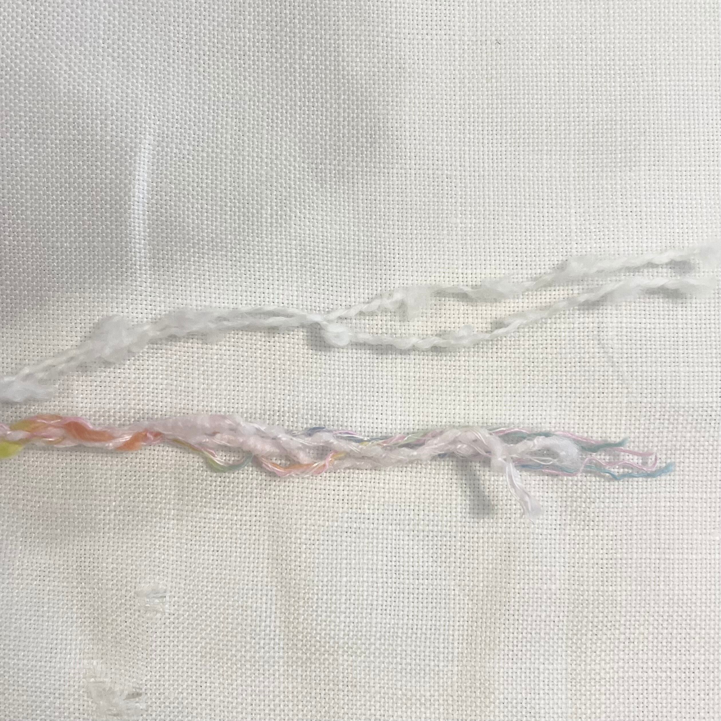 ①白の2本取りぽこぽこヤーン②ピンクベースにカラフルな毛が入ったヤーンの計2本を引き揃えてます♪