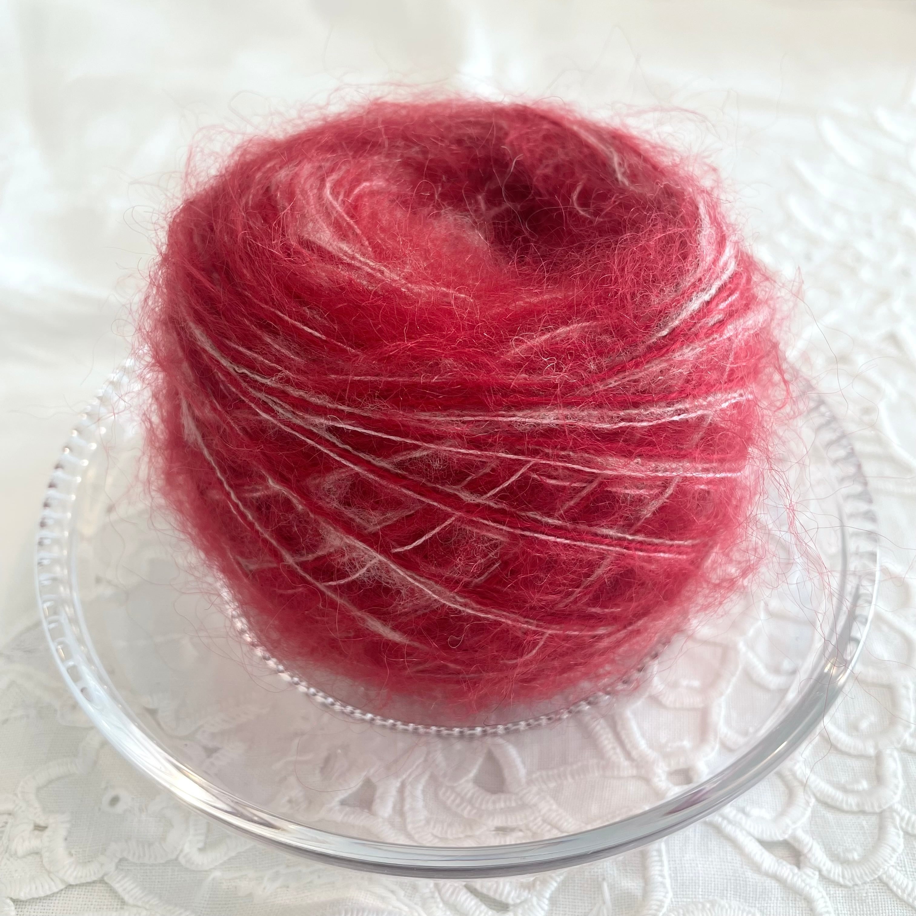 赤のモヘアヤーン、ピンクベージュのモヘアヤーン、薄ピンクのウールヤーンの計3本を引き揃えてます♪
