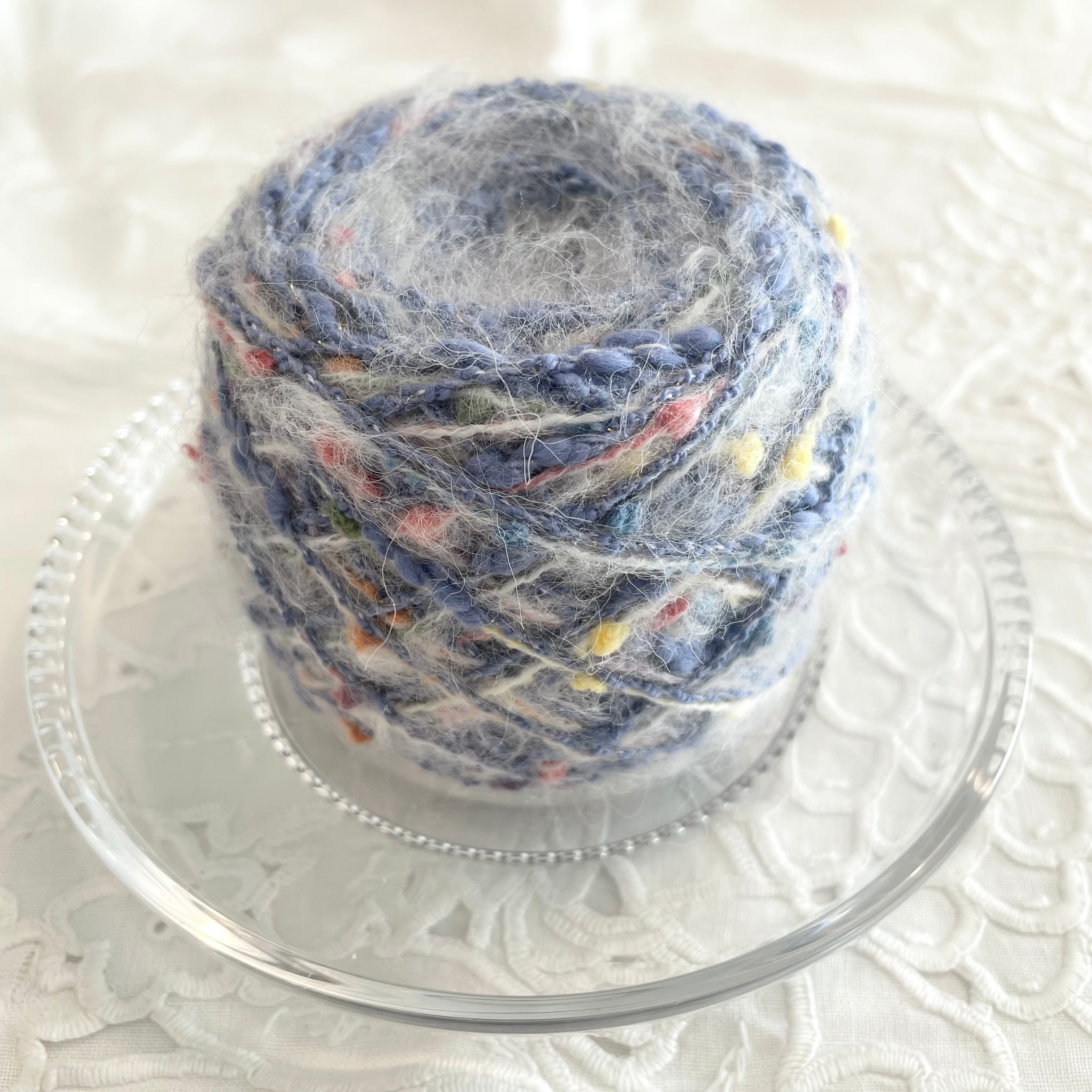 ブルーの毛にシルバーのラメが入ったぽこぽこヤーン、白い糸にカラフルなつぶつぶヤーンの計2本を引き揃えてます♪