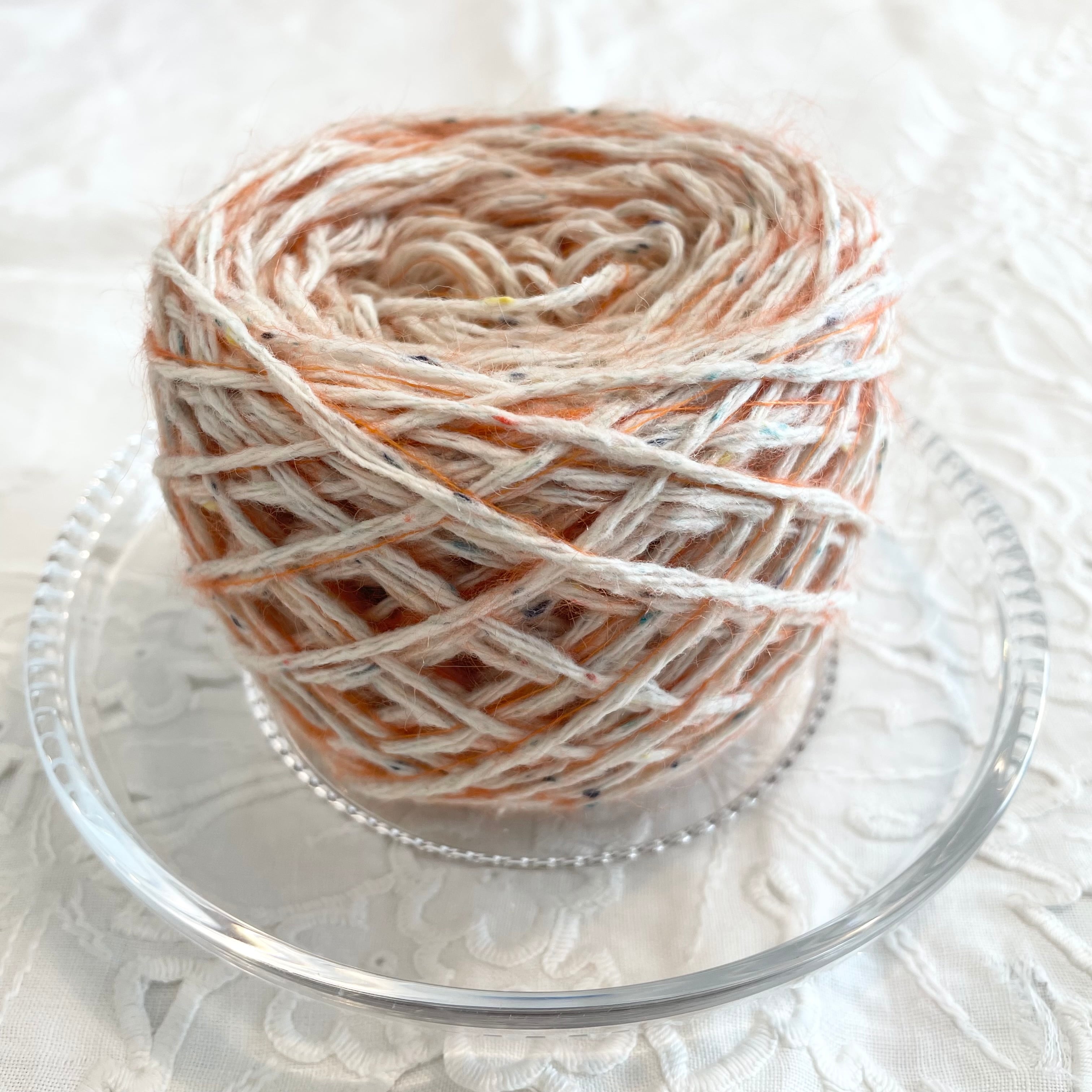 アイボリーベースのネップヤーン、ビビッドオレンジのモヘアヤーン、の計2本を引き揃えてます♪