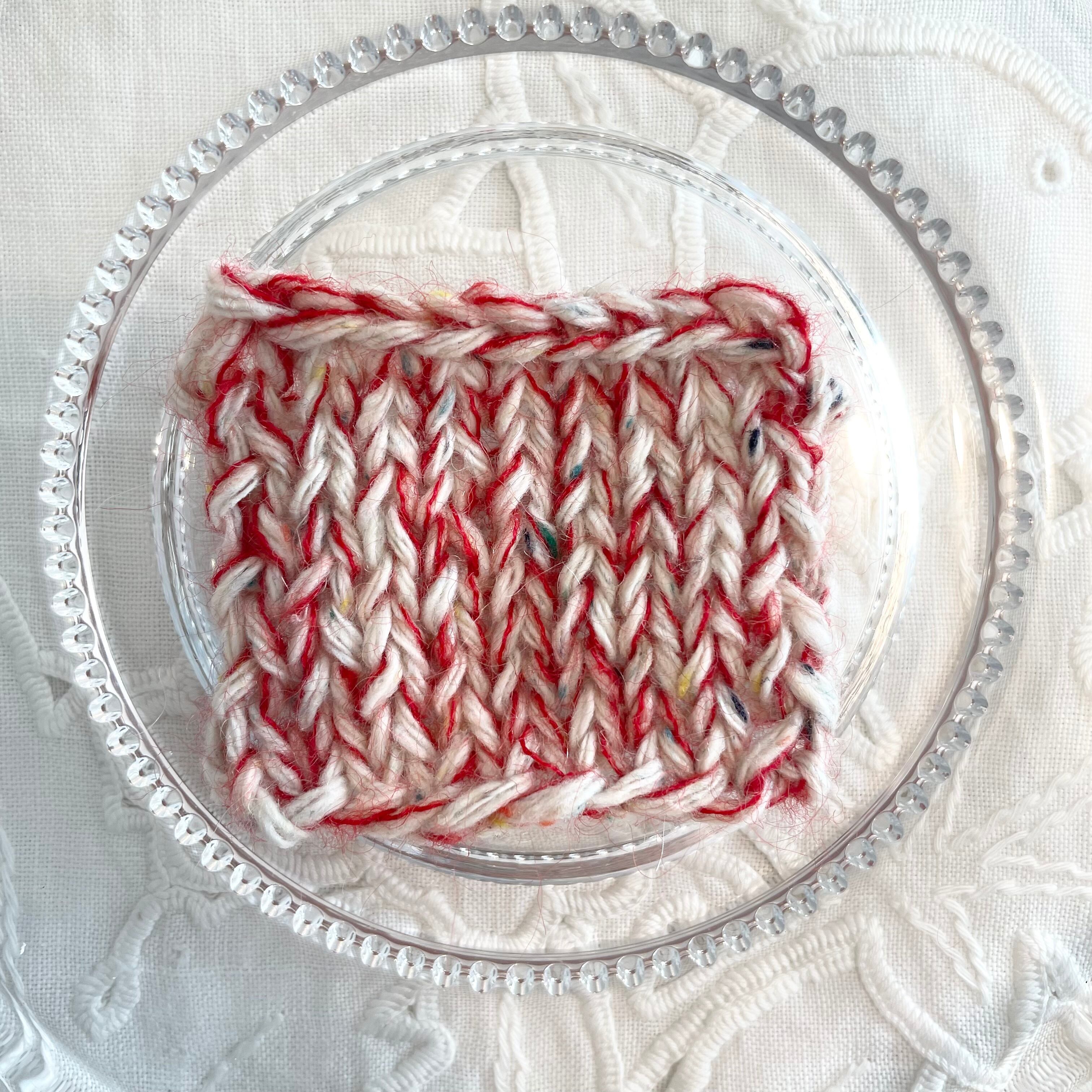 アイボリーベースのネップヤーン、赤のモヘアヤーンの計2本を引き揃えてます♪