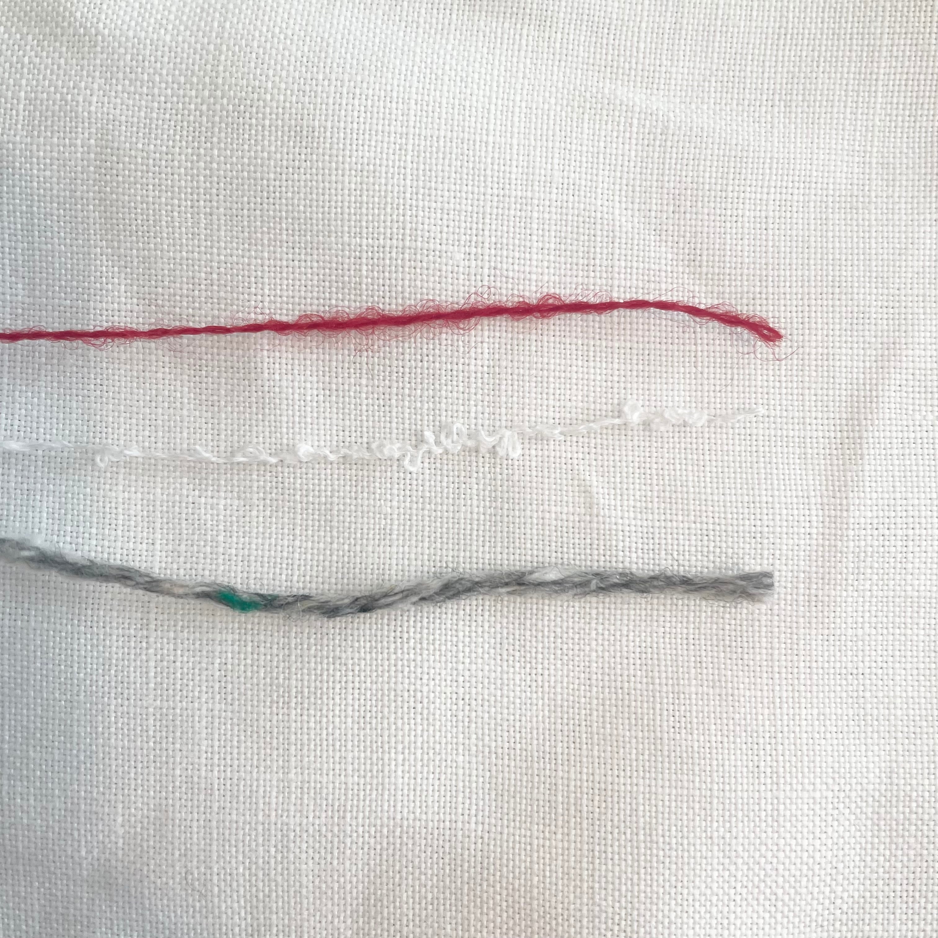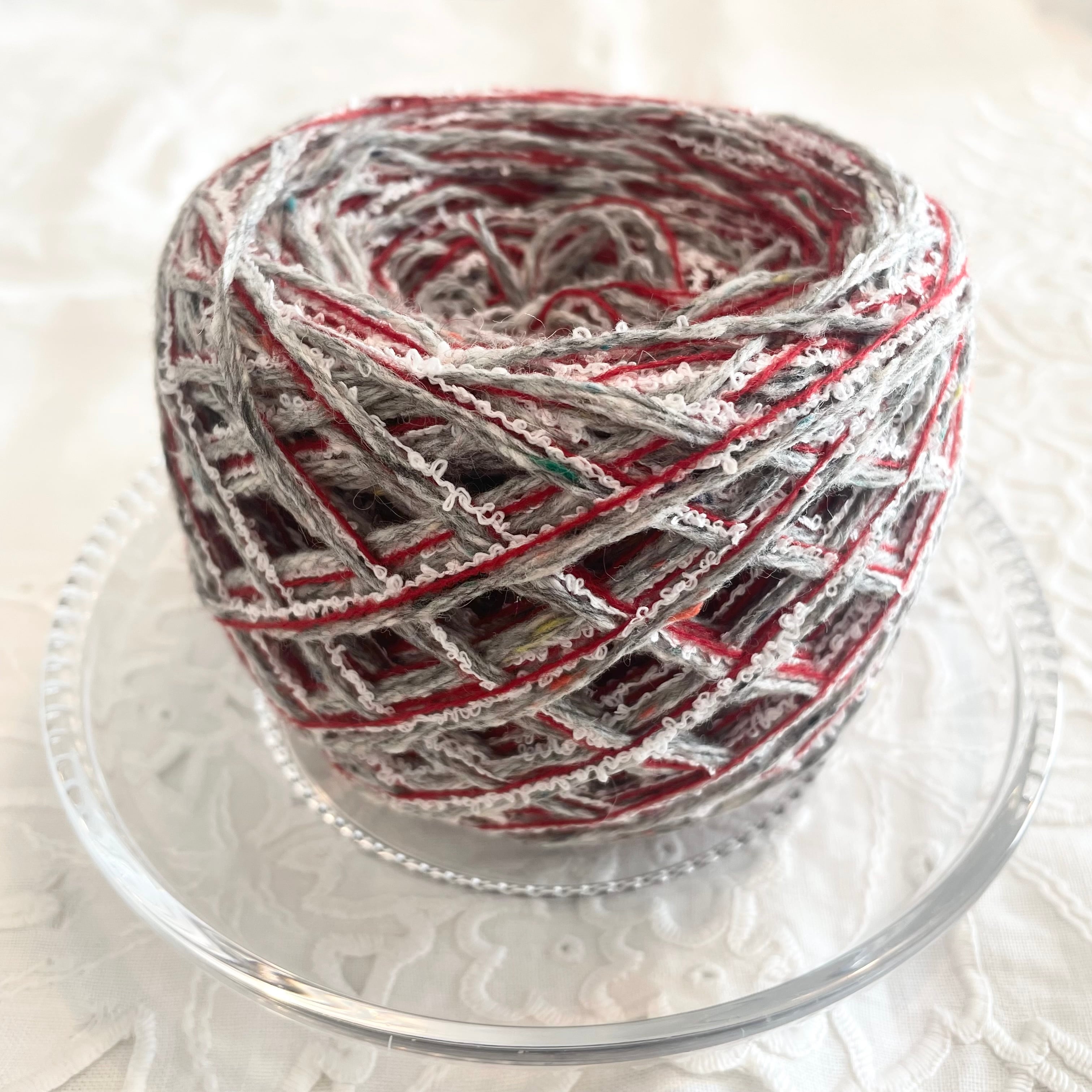 グレーベースのネップヤーン、赤のウールヤーン、ホワイトのループヤーンの計3本を引き揃えてます♪