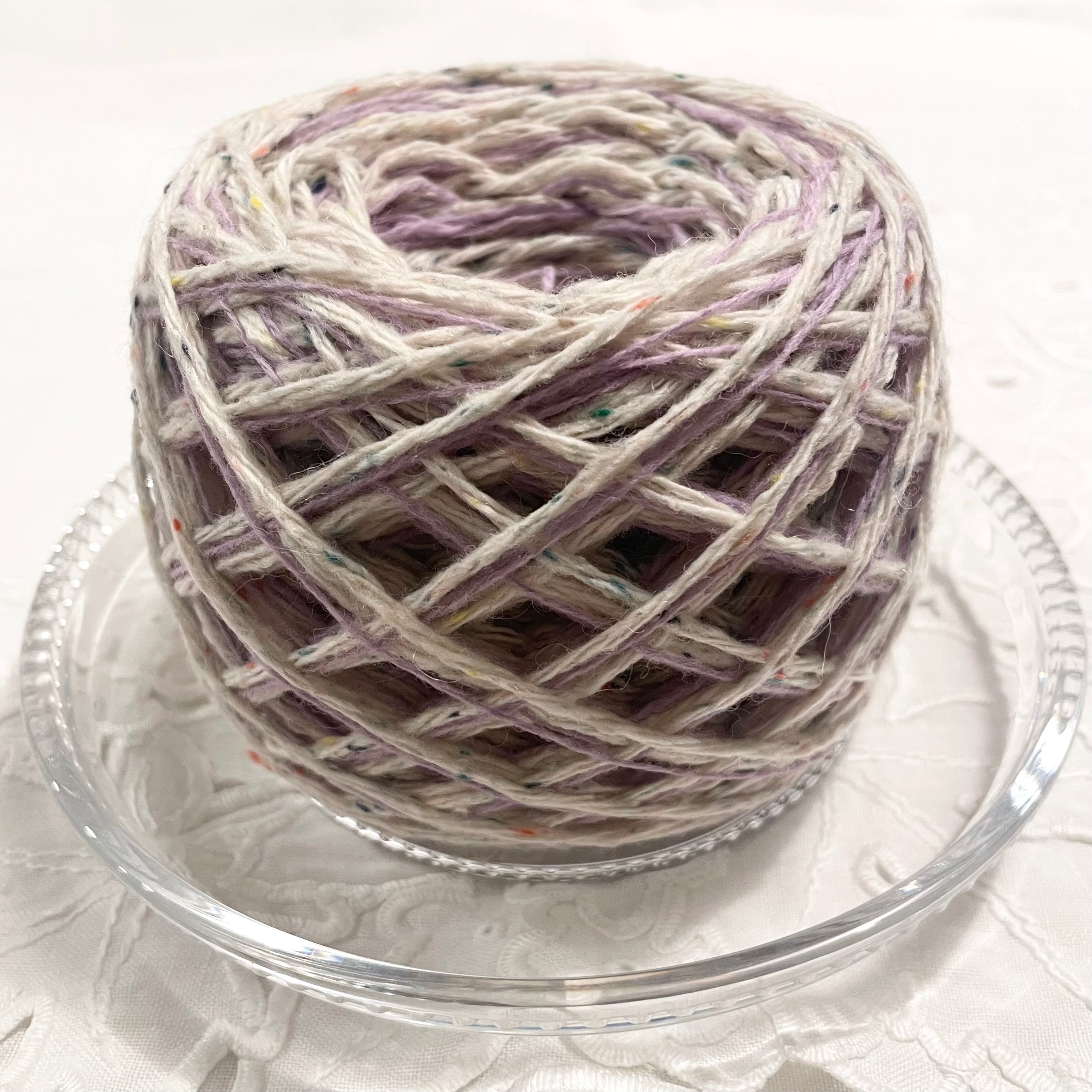 アイボリーベースのネップヤーン、ラベンダーのウールヤーンの計2本を引き揃えてます♪