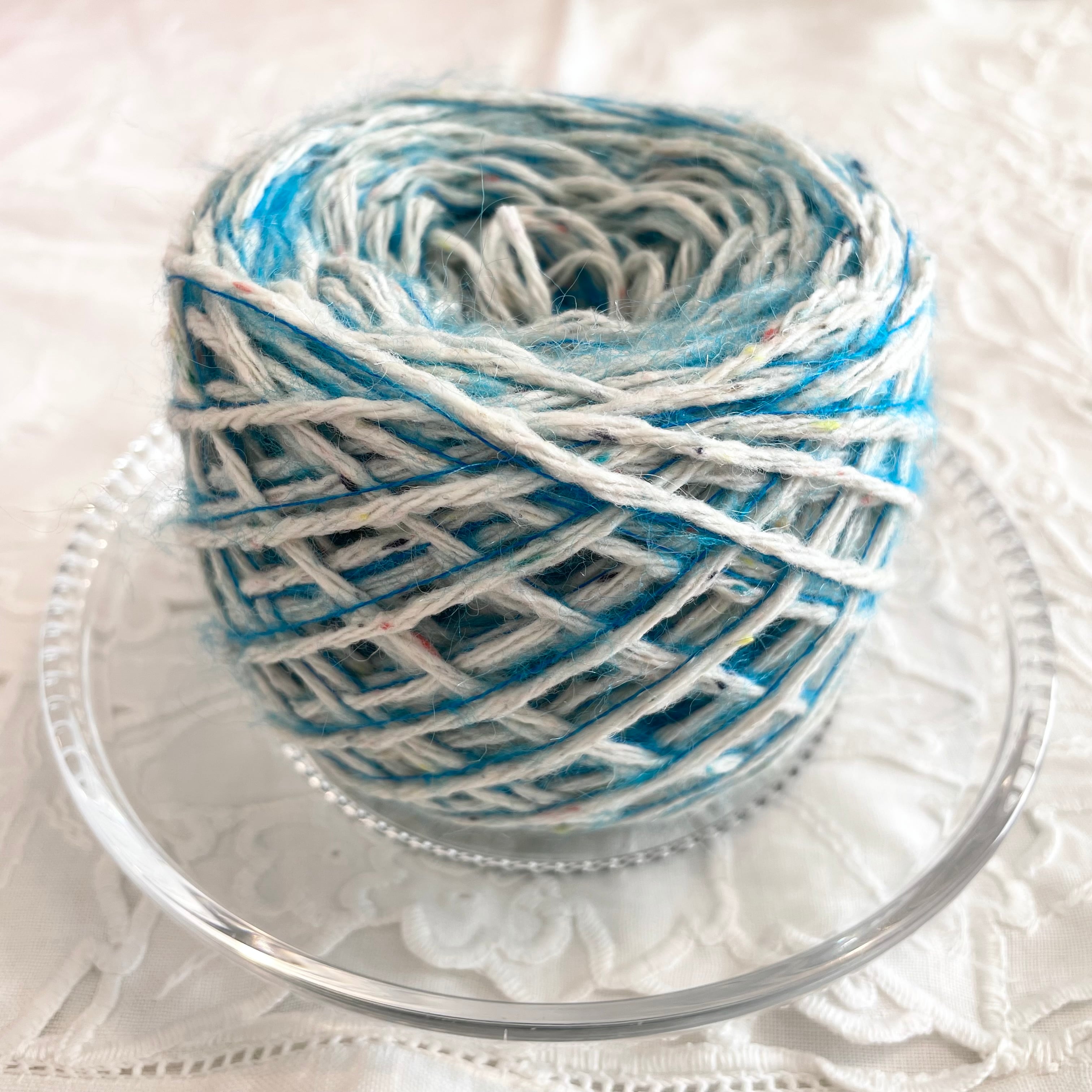 アイボリーベースのネップヤーン、ターコイズブルーのモヘアヤーンの計2本を引き揃えてます♪