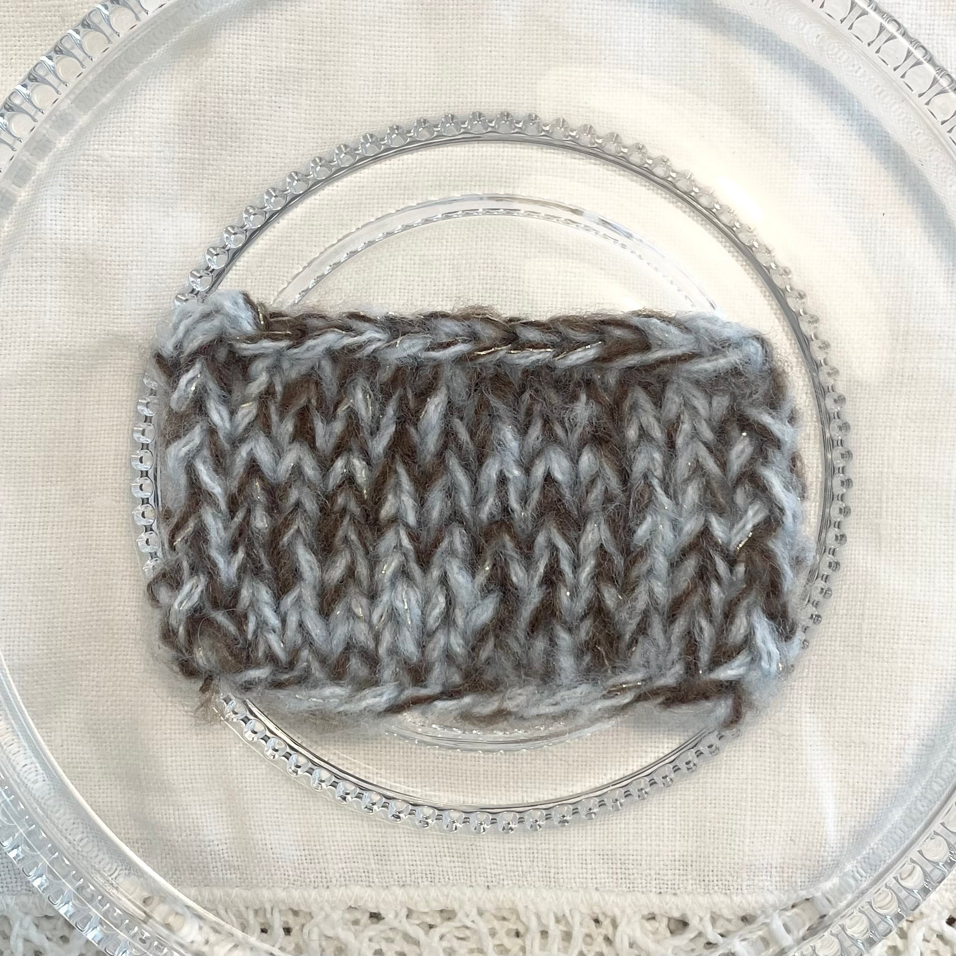 ブラウンのモヘアヤーン、水色の2本取りモヘア風ヤーン、ゴールドのラメ糸の計4本を引き揃えてます♪