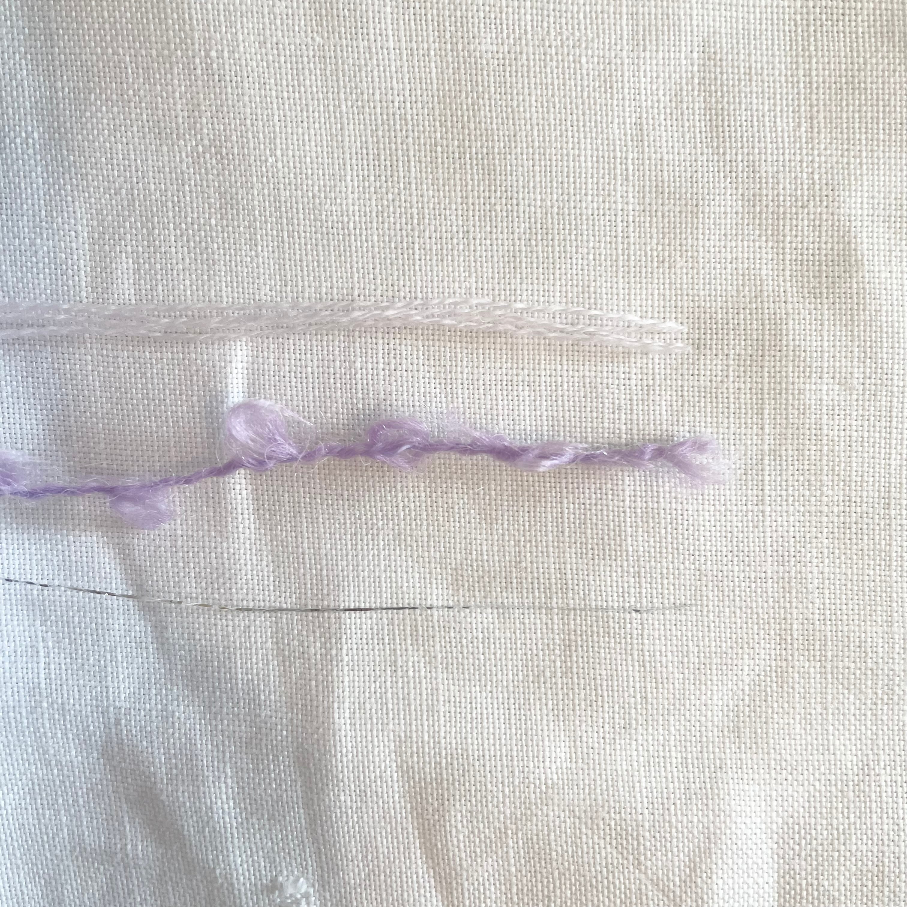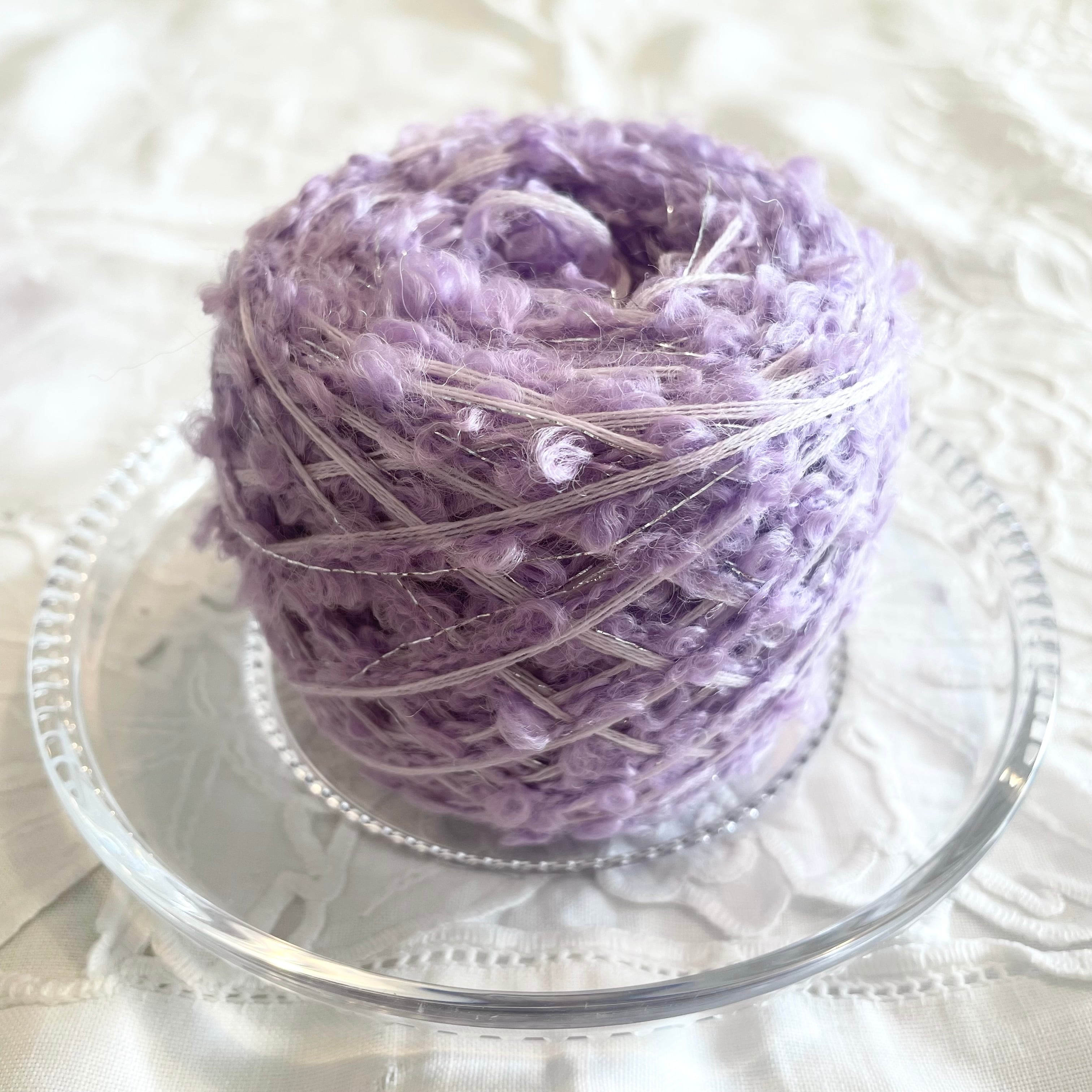 パープルのプードルヤーン、薄ピンクの4本取りヤーン、シルバーのラメ糸の計6本を引き揃えてます♪