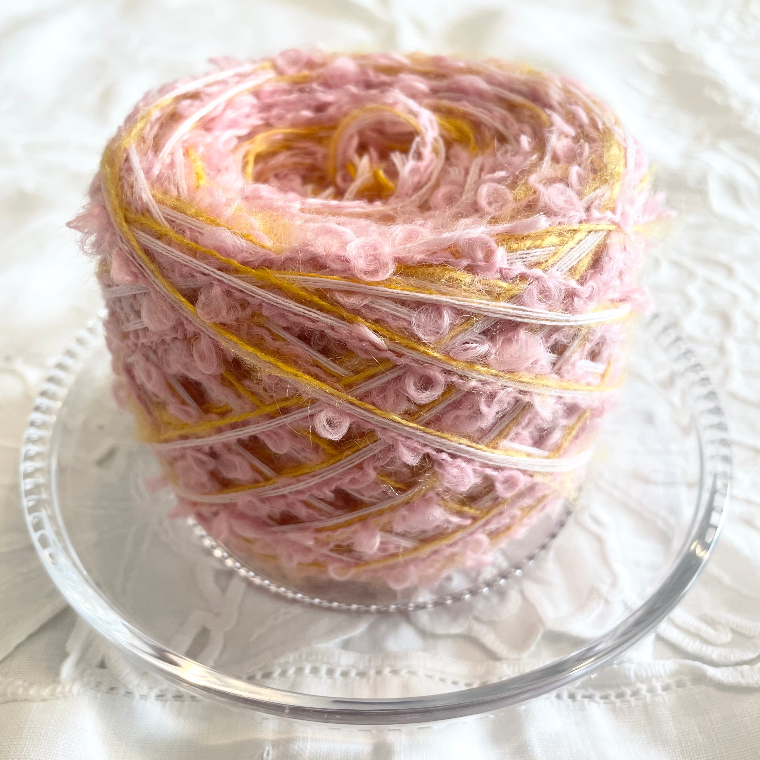 ピンクのプードルヤーン、薄ピンクの4本取りヤーン、マスタードのモヘアヤーンの計6本を引き揃えてます♪