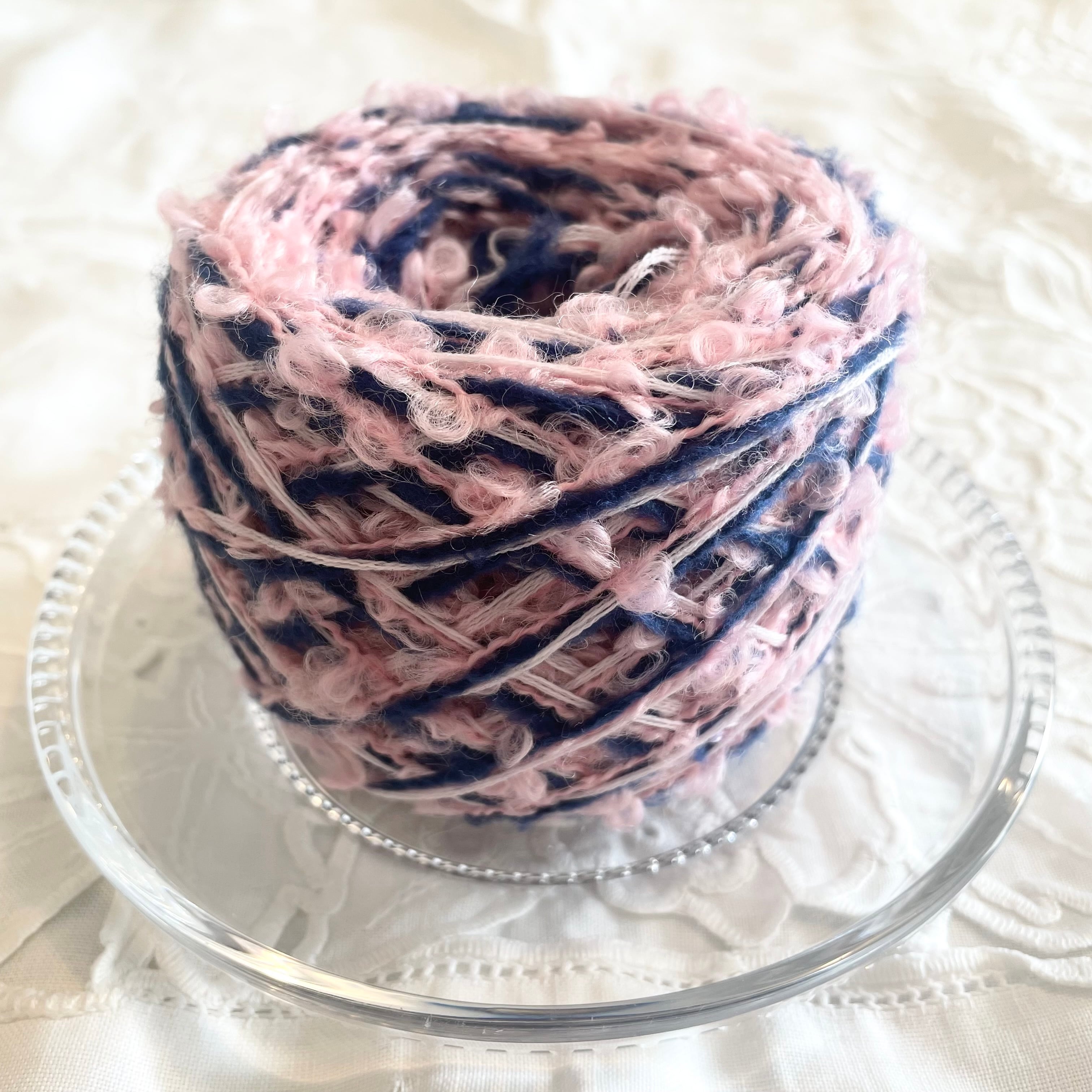 ピンクのプードルヤーン、薄ピンクの4本取りヤーン、ネイビーのモヘアヤーンの計6本を引き揃えてます♪