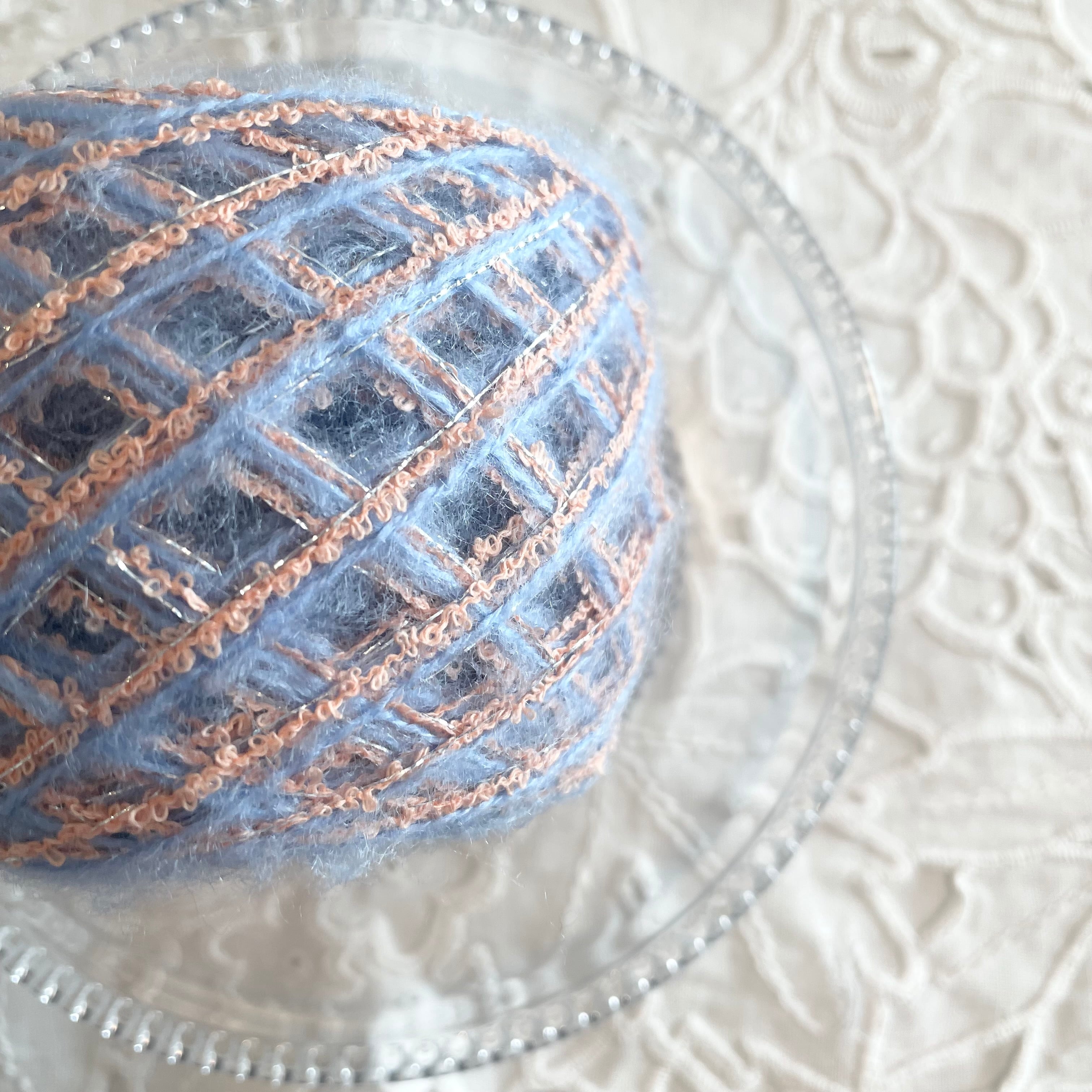 ブルーのモヘアヤーン、オレンジのループヤーン、シルバーのラメ糸の計3本を引き揃えてます♪