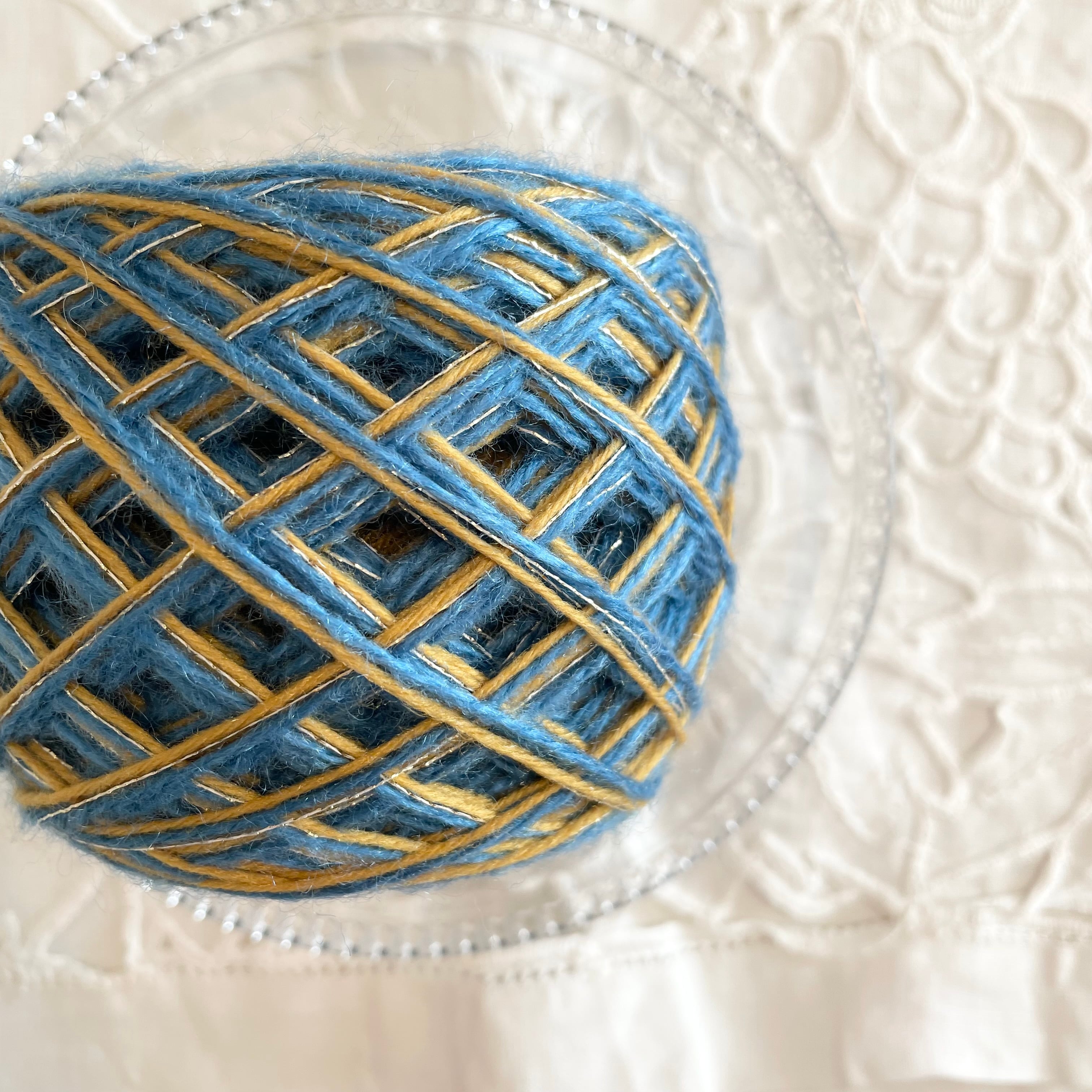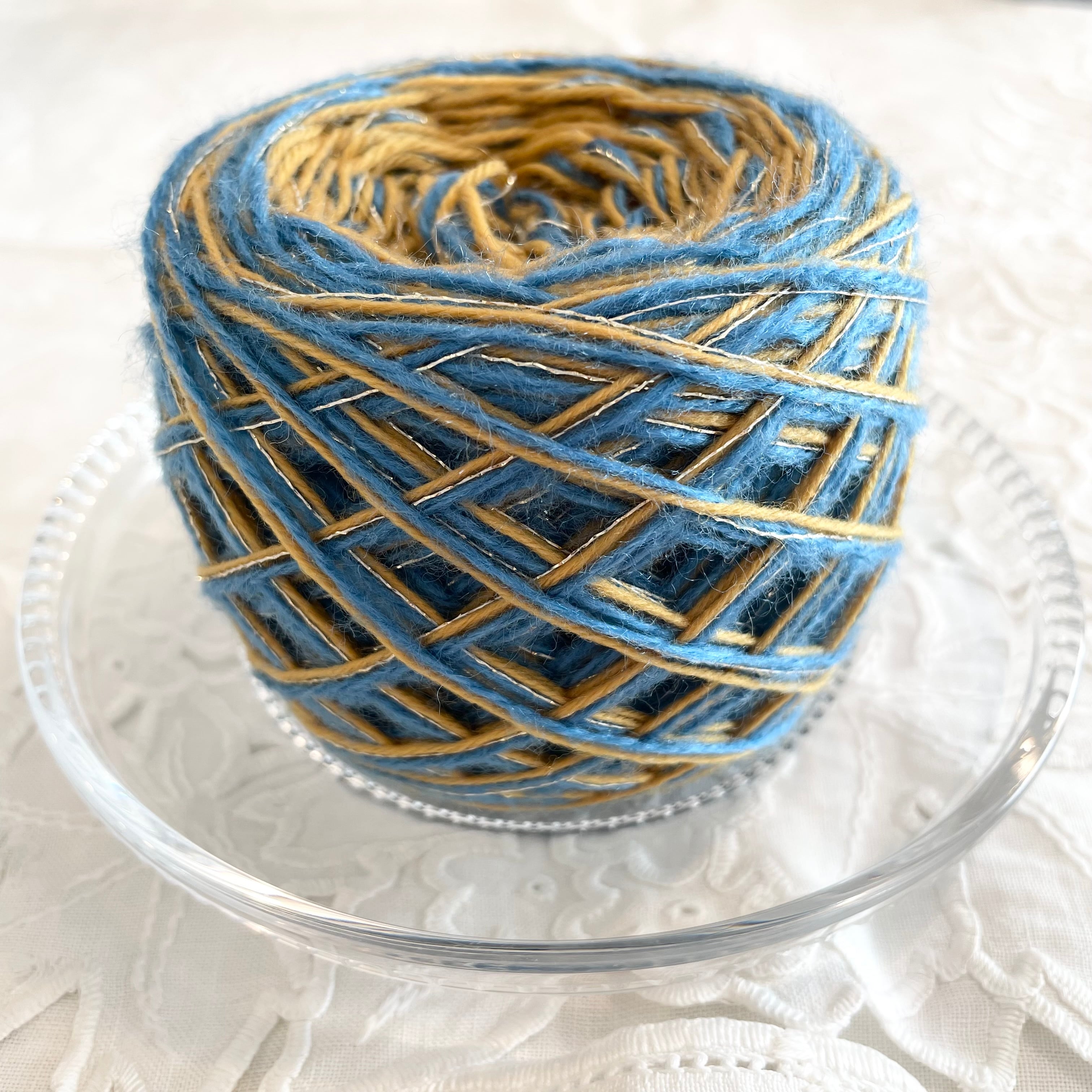ブルーのアクリルヤーン、マスタードのポリエステルヤーン、ゴールドのラメ糸の計3本を引き揃えてます♪