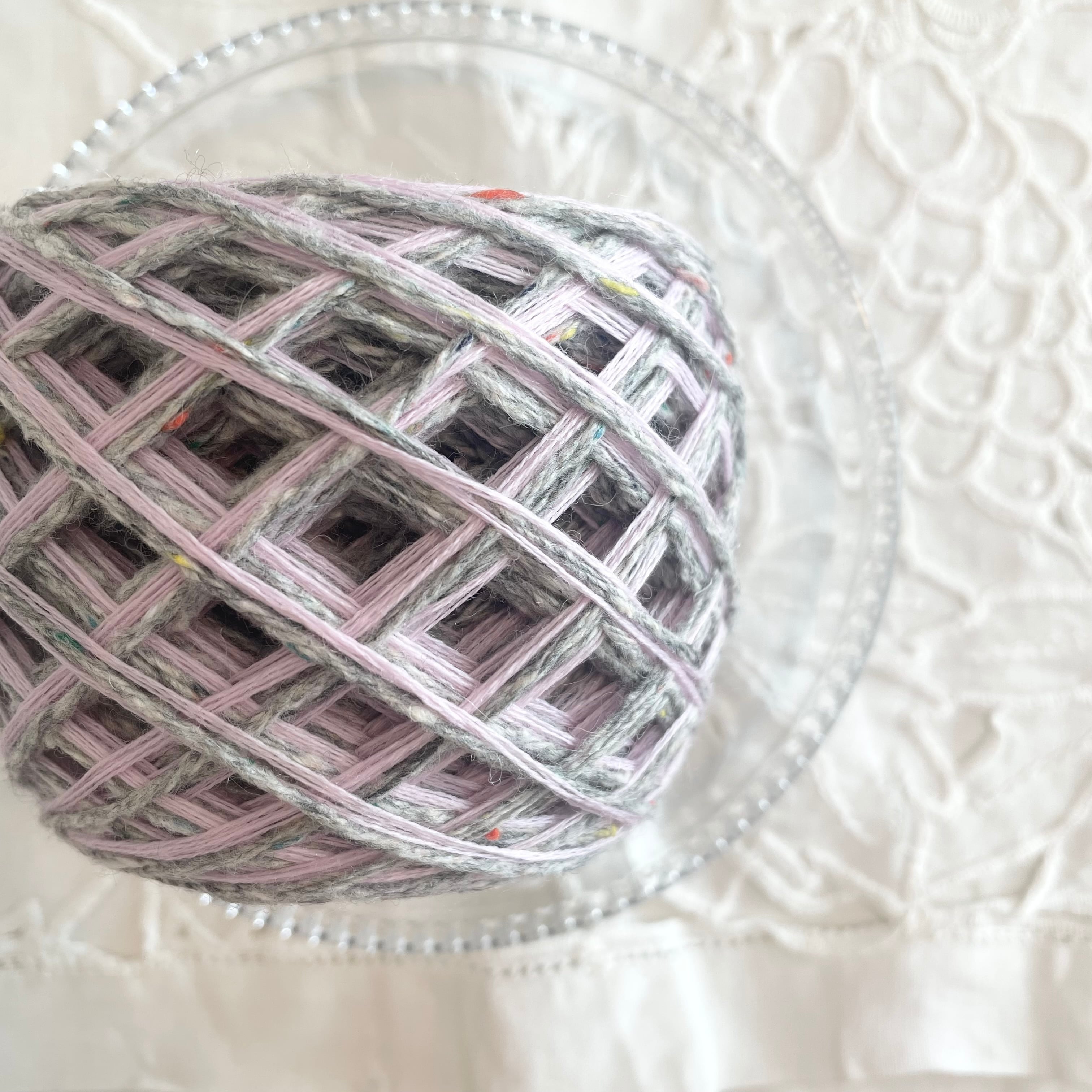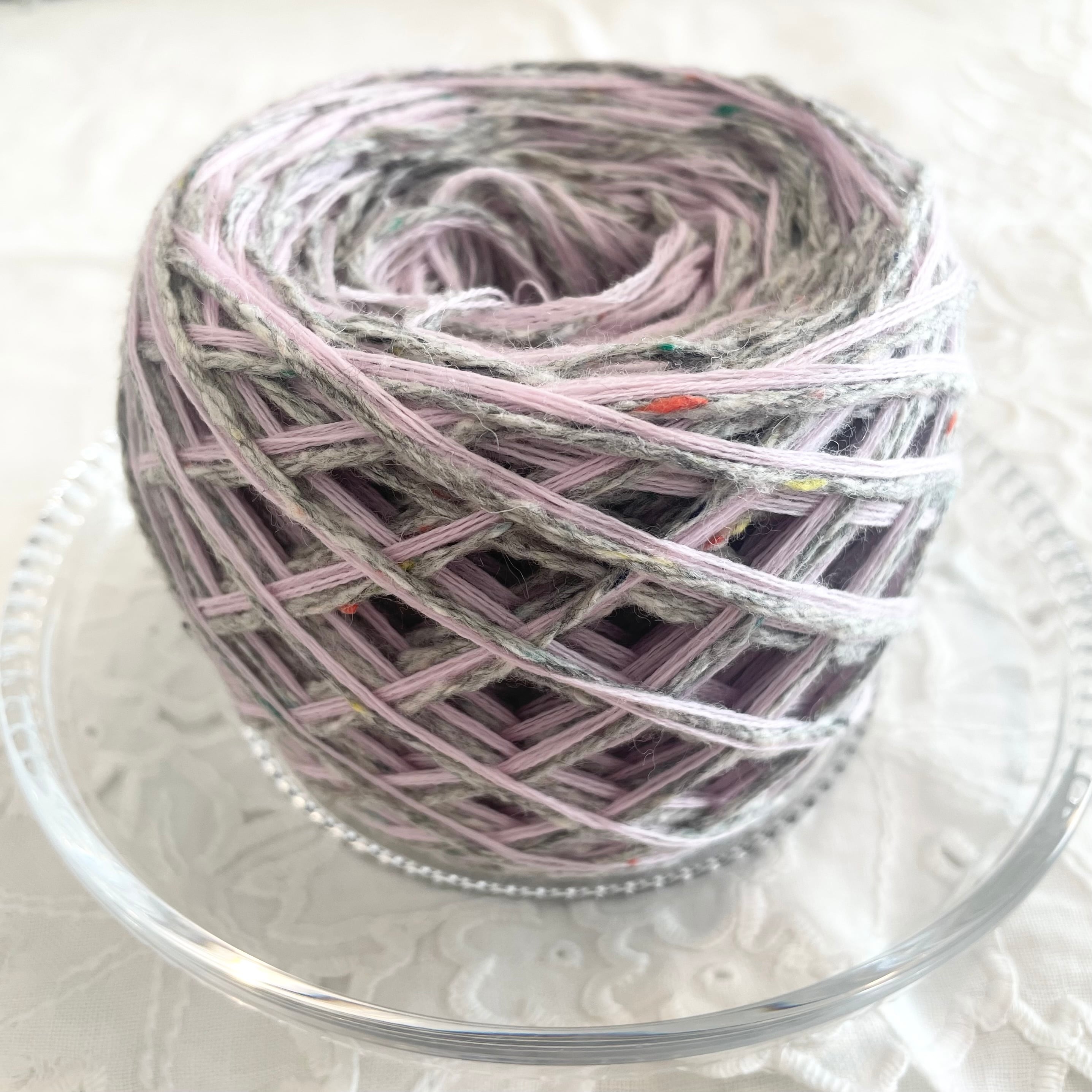 グレーのネップヤーン、ライラックの3本取りヤーンを2本の計7本を引き揃えてます♪