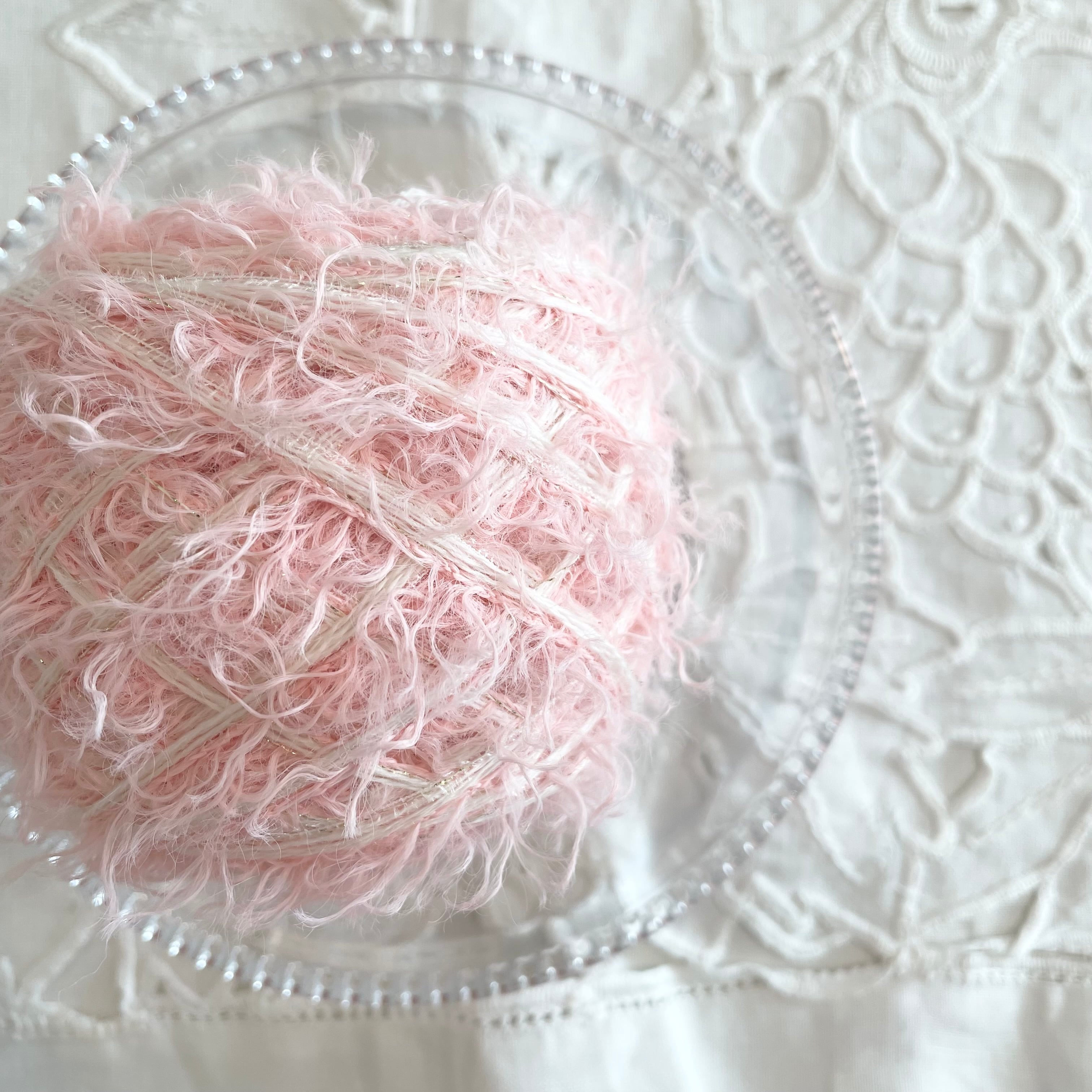 ピンクのふわふわヤーン、ホワイトの3本取りヤーン、ホワイトのコットンヤーン、ゴールドのラメ糸の計6本を引き揃えてます♪