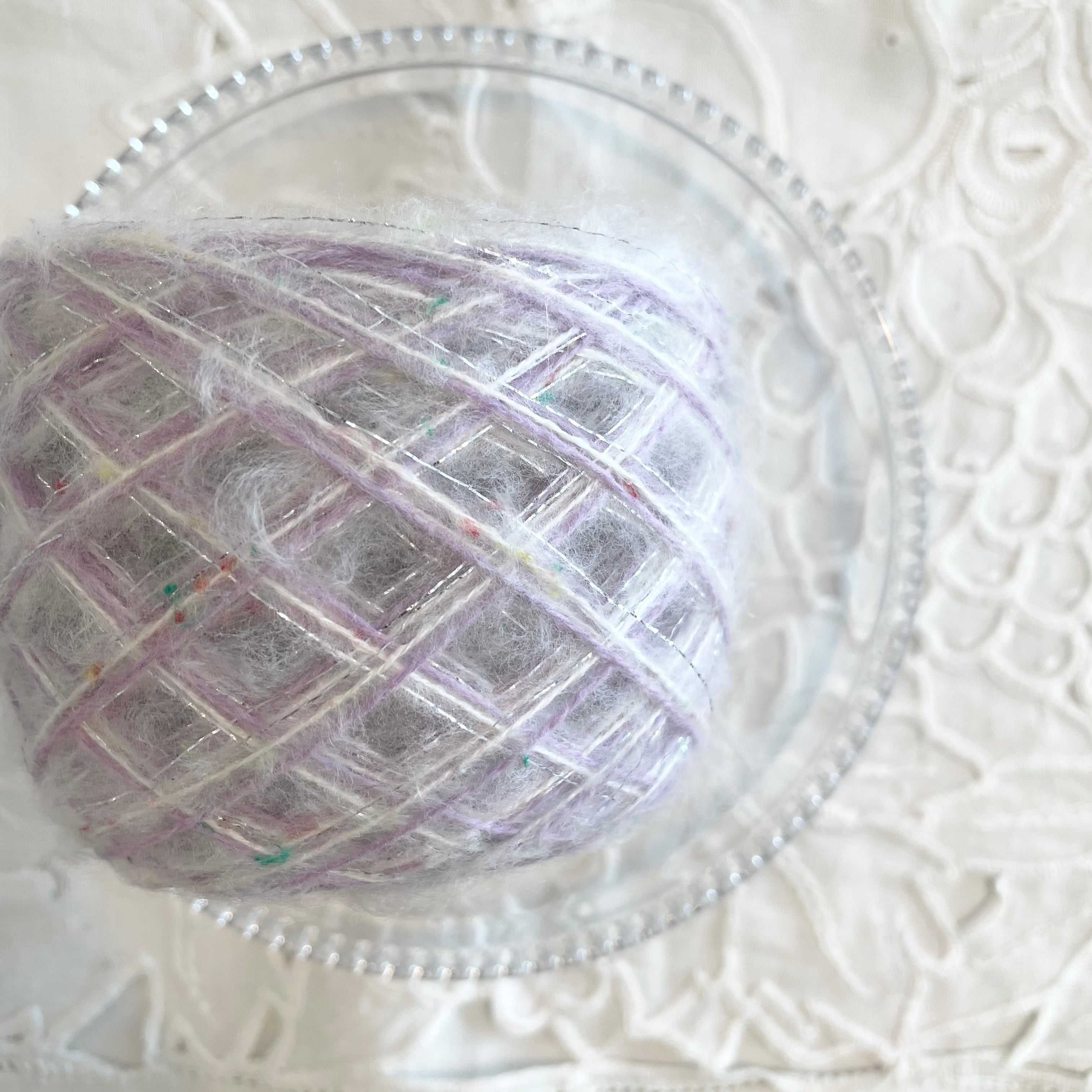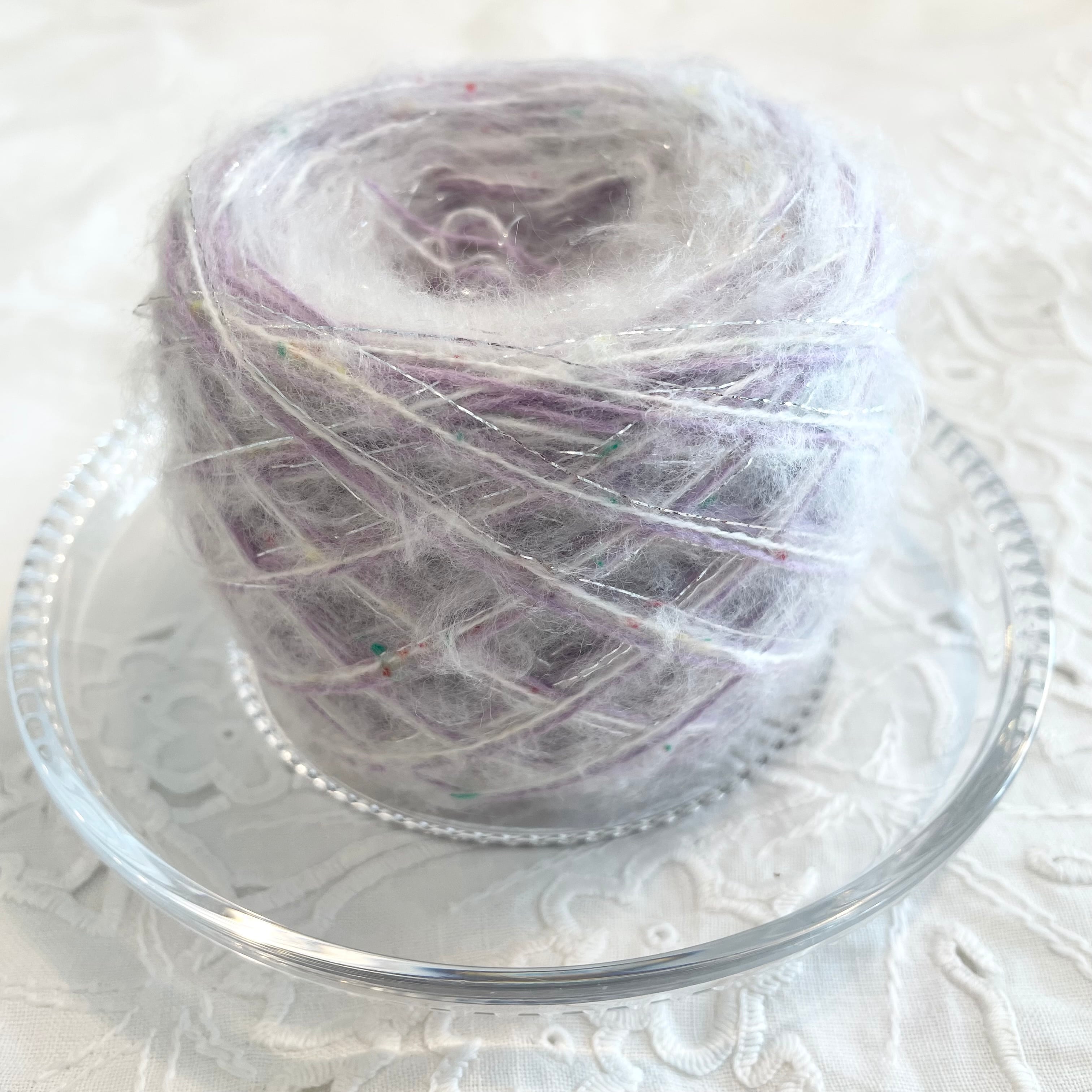 ホワイトのモヘア風ネップヤーン、ラベンダーのウールヤーン、シルバーのラメ糸の計3本を引き揃えてます♪