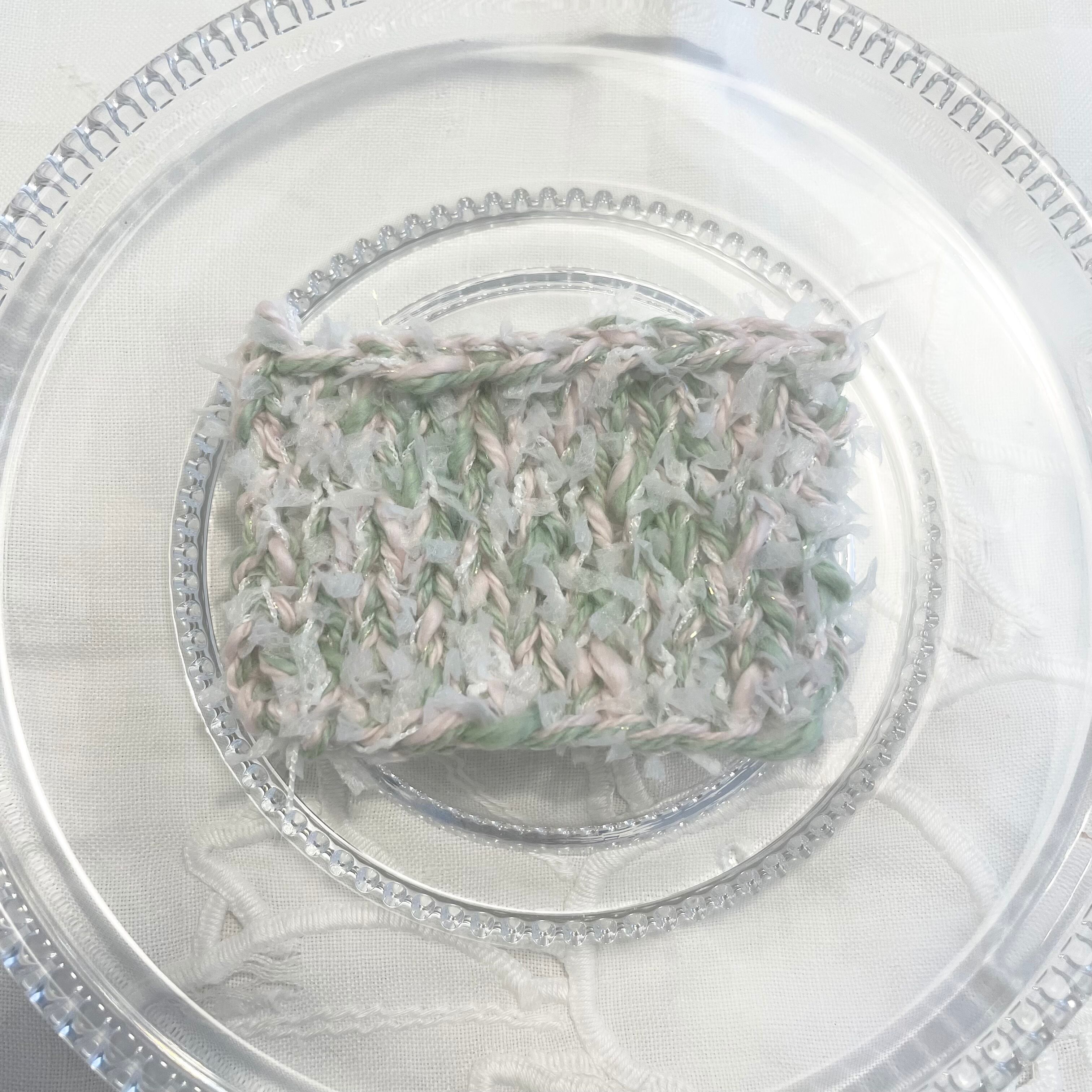 ホワイトのリボンヤーン、ピンクのコットンヤーン、グリーンのコットンヤーン、オーロラのラメ糸の計4本を引き揃えてます♪