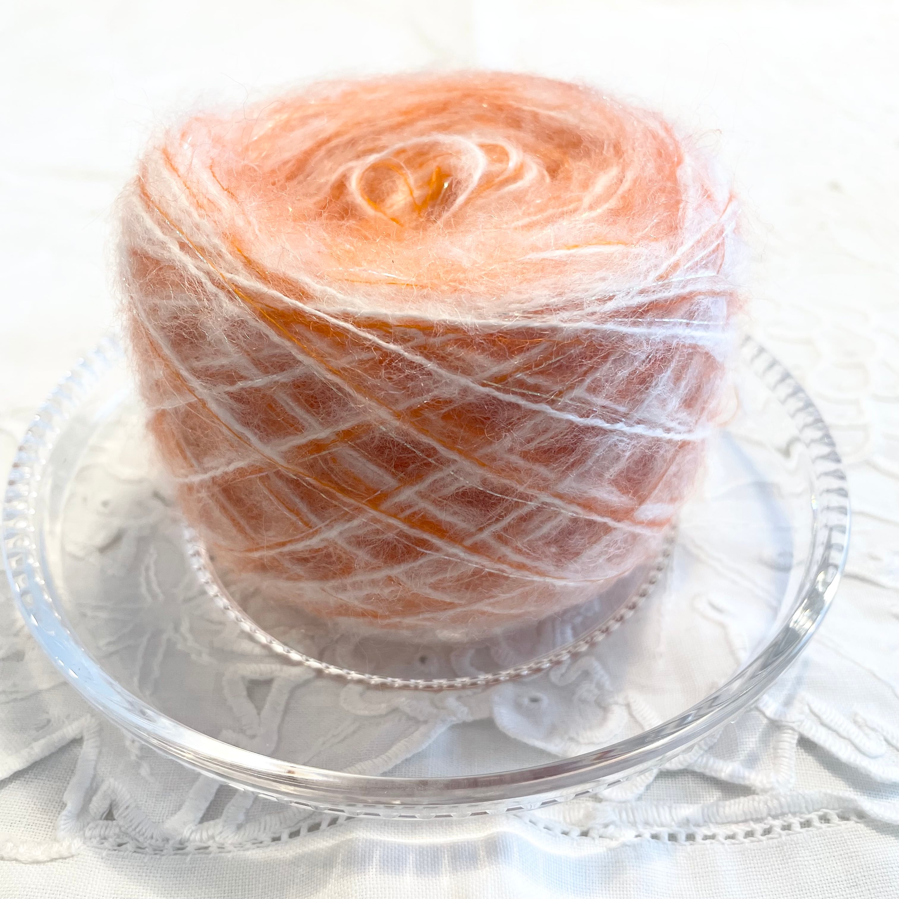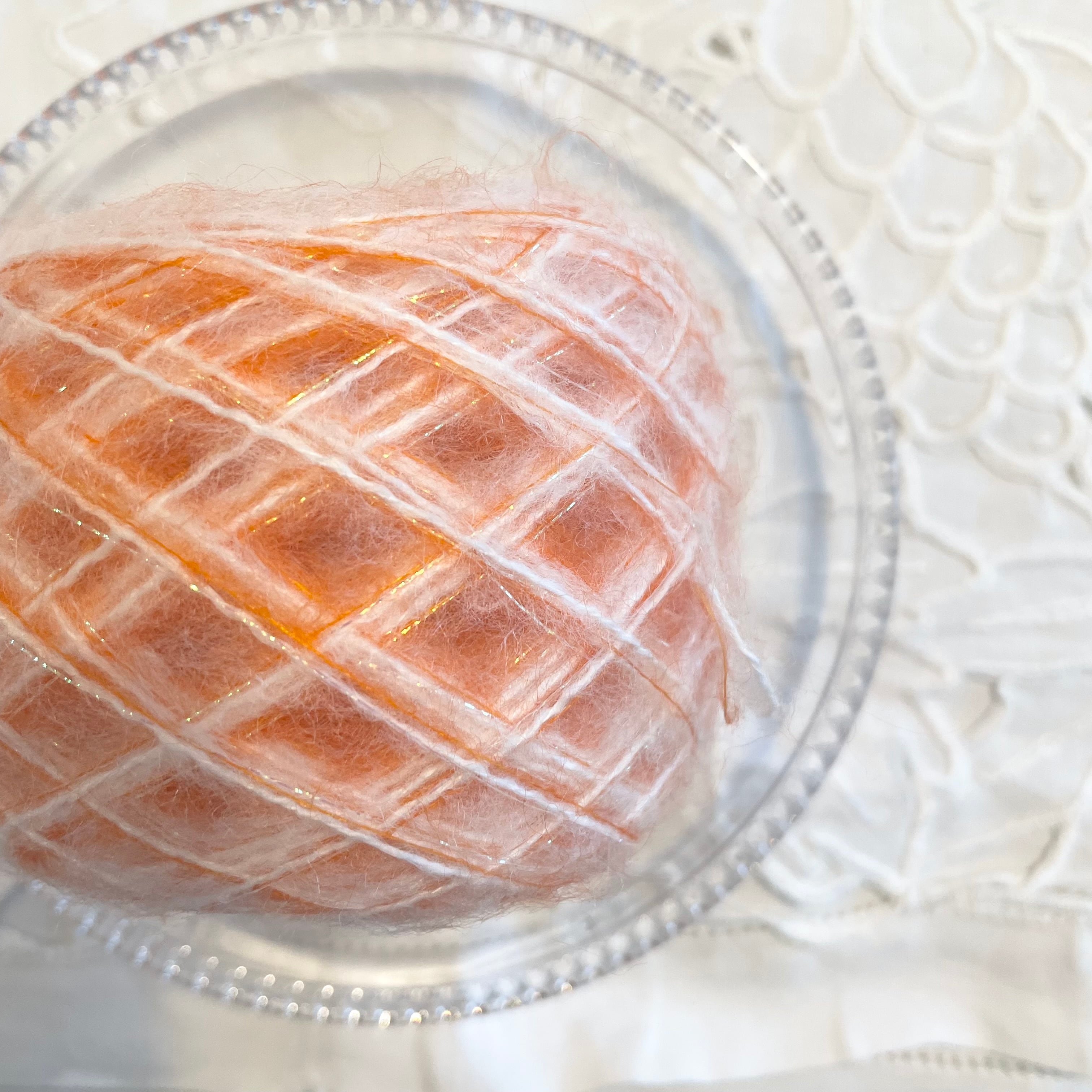 オレンジのモヘアヤーン、ホワイトのモヘア風ヤーン、オーロラのラメ糸の計3本を引き揃えてます♪
