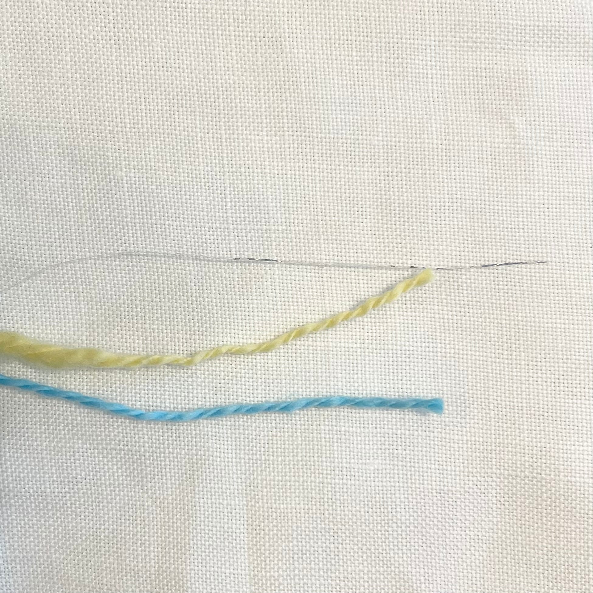 イエローのコットンヤーン、ブルーのコットンヤーン、シルバーのラメ糸の計3本を引き揃えてます♪
