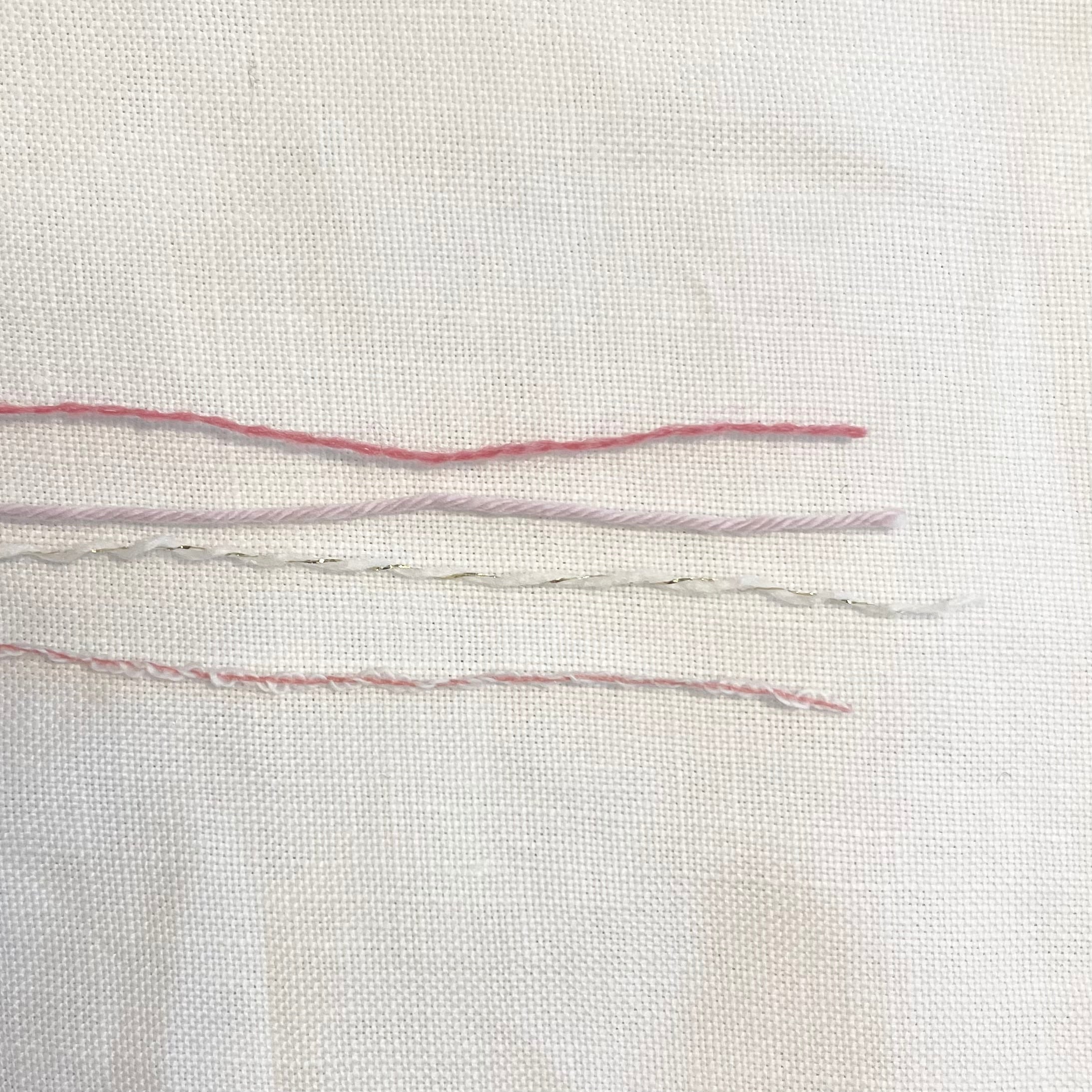 ピンクのコットンヤーン、ピンクのマーブルヤーン、ホワイトのラメ入りコットンヤーン、ホットピンクのウールヤーンの計4本を引き揃えてます♪