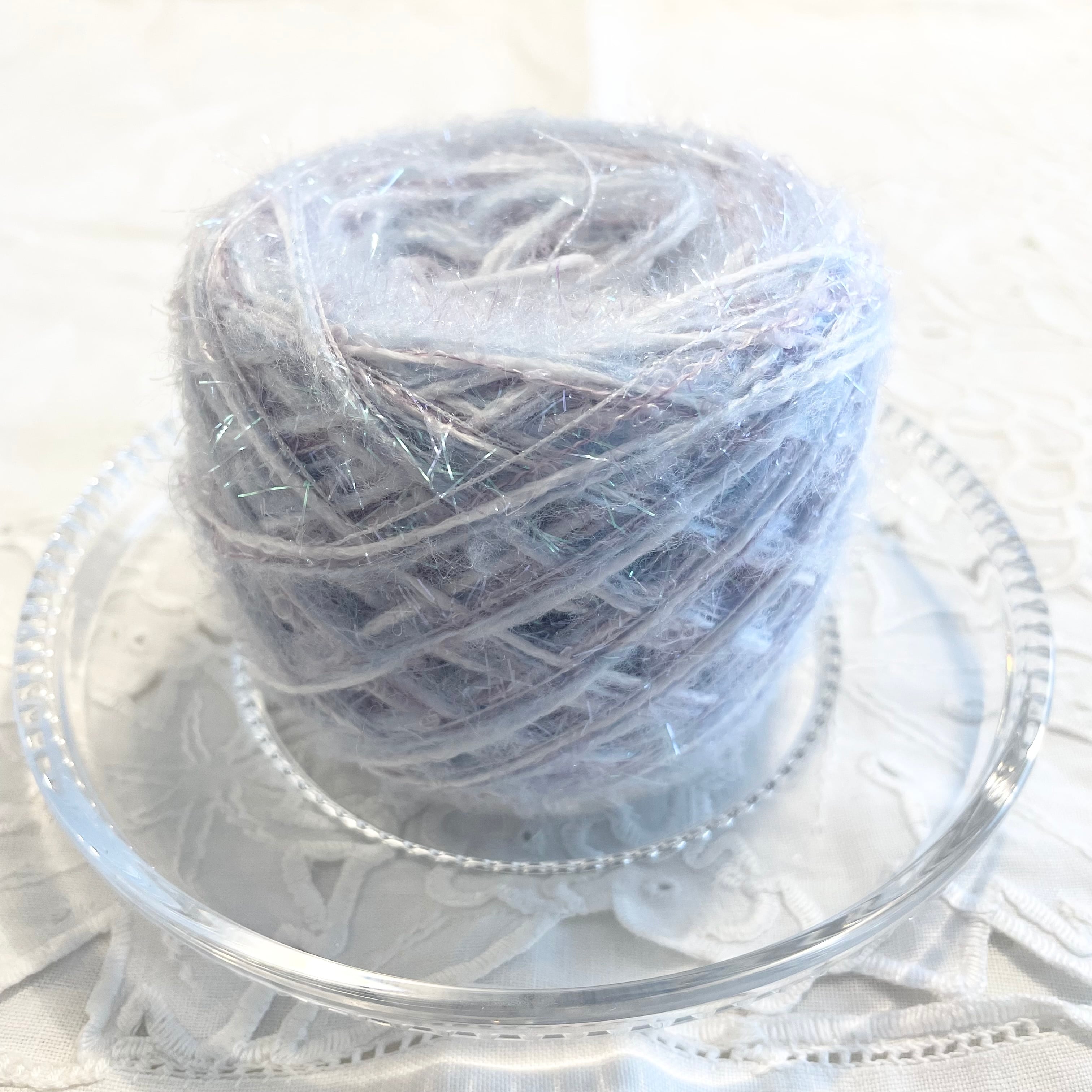 ホワイトのコットンヤーン、水色のモヘア風ヤーン、ラベンダーのループヤーン、オーロラのキラキラヤーンの計4本を引き揃えてます♪