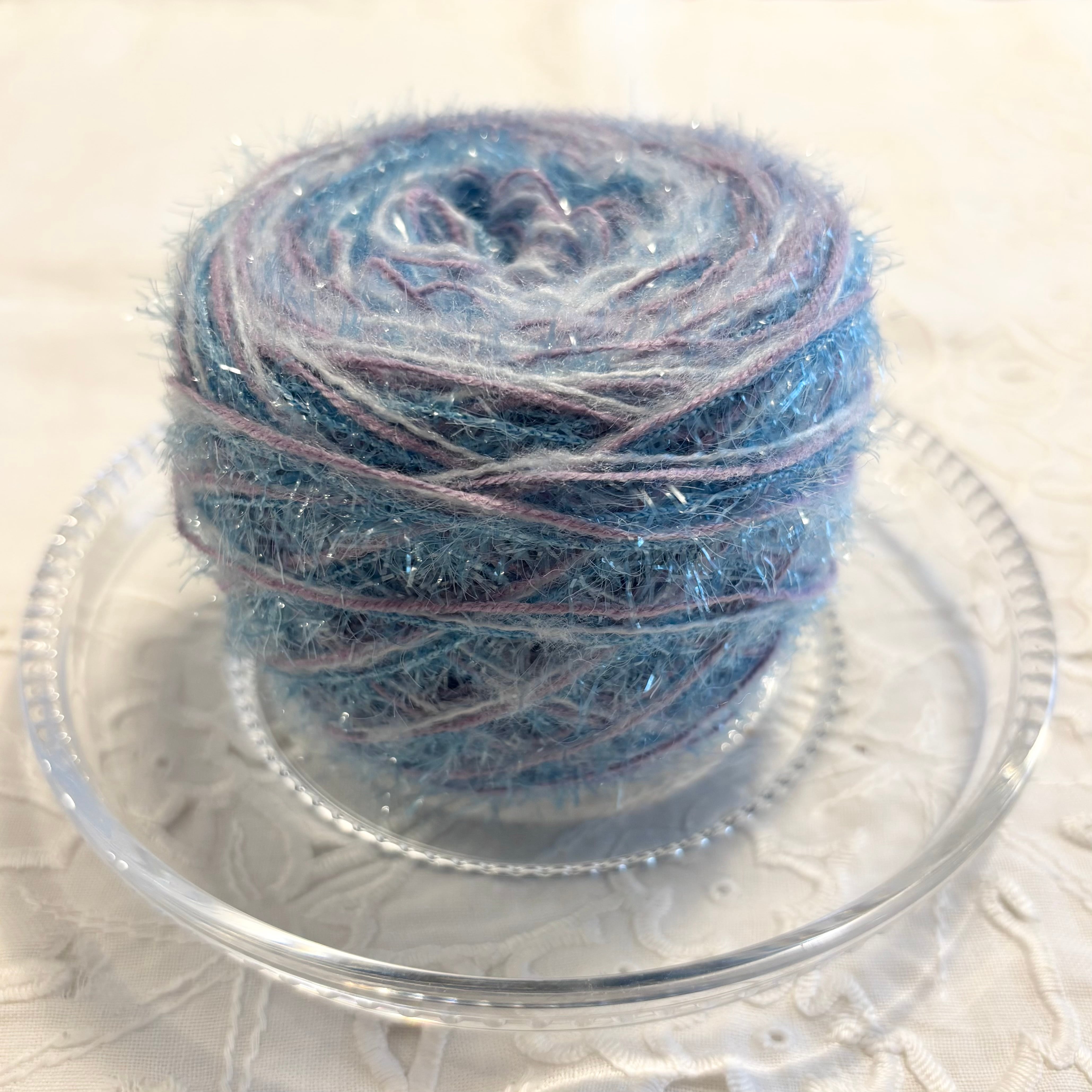ブルーのキラキラヤーン、ラベンダーのコットンヤーン、水色のアクリルヤーンの計3本を引き揃えてます♪