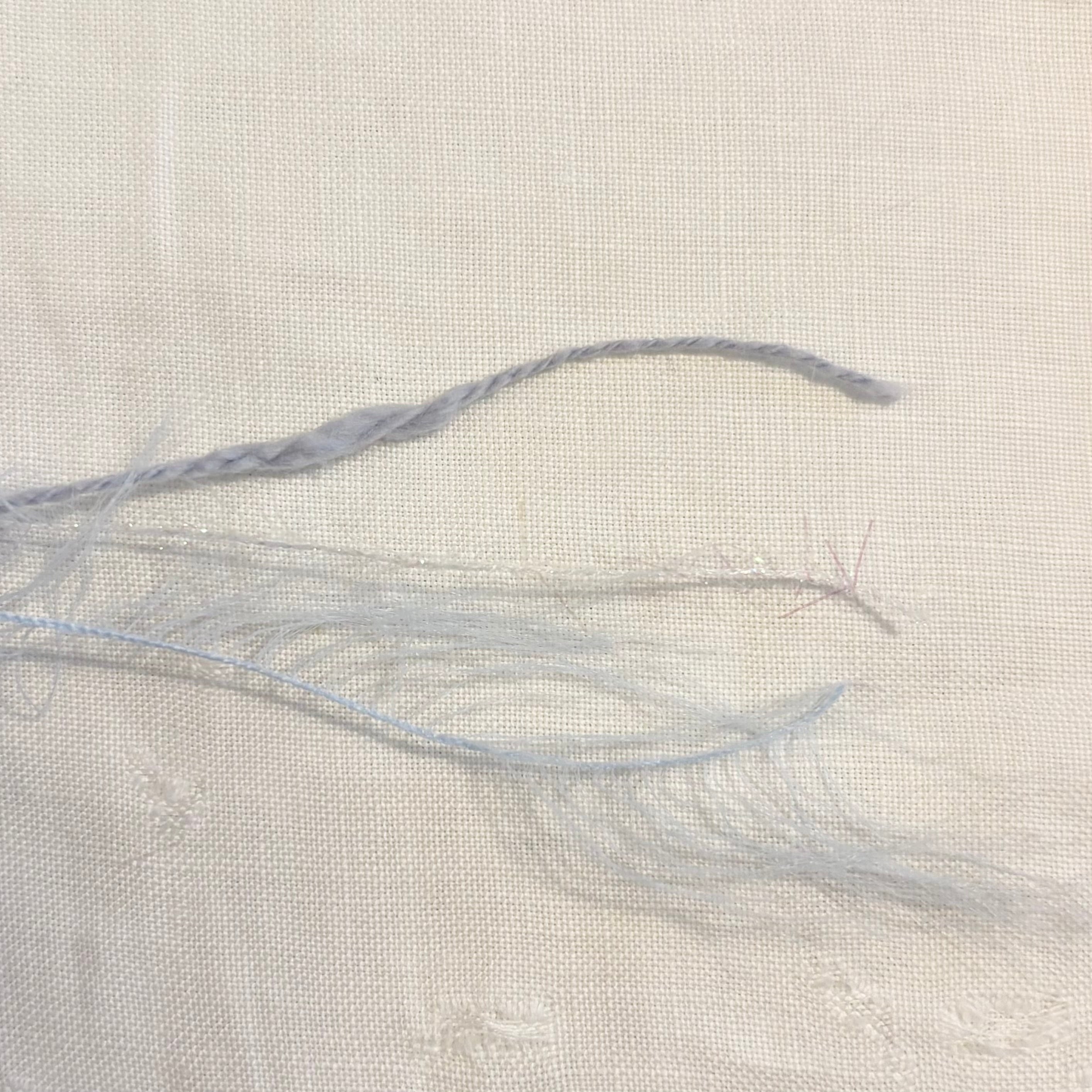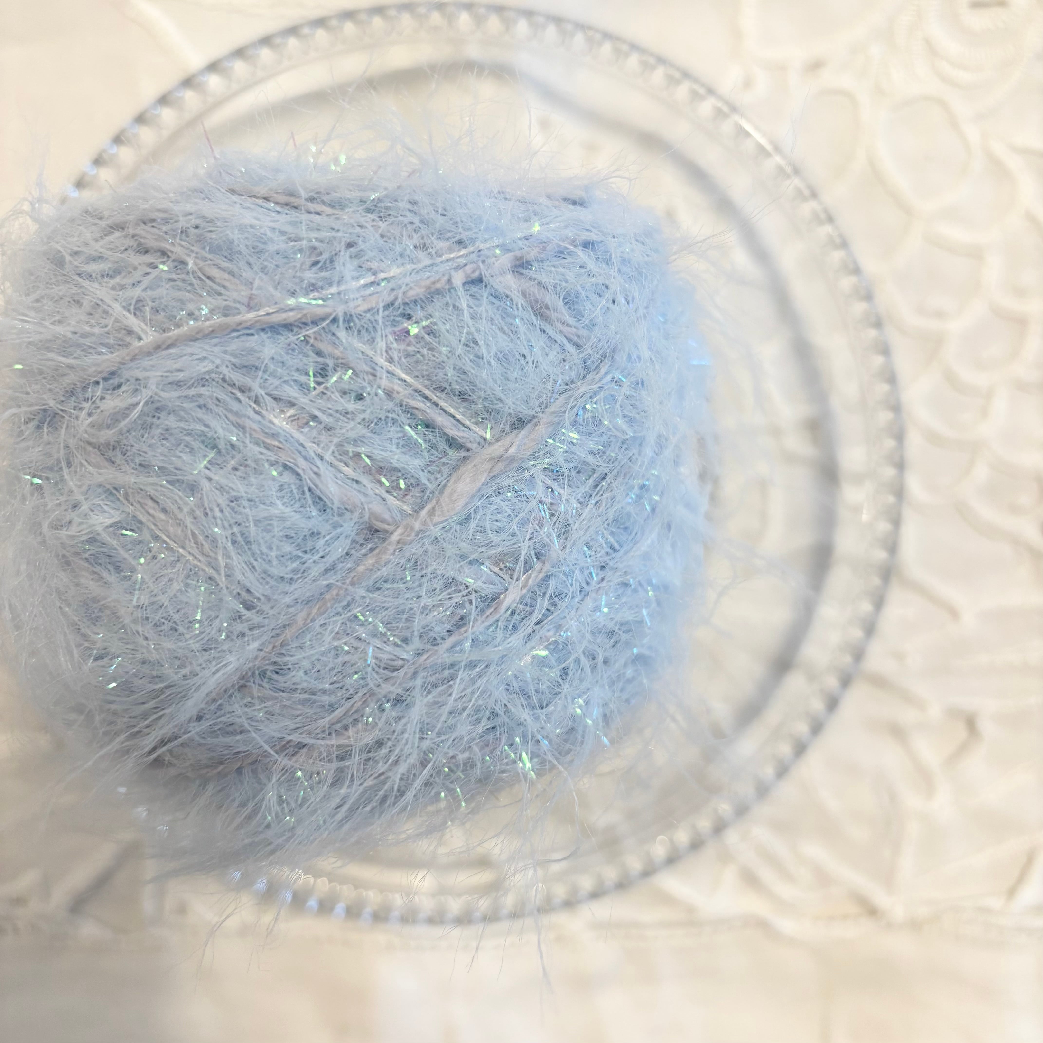 オーロラのキラキラヤーン、水色のファーヤーン、ブルーのコットンヤーンの計3本を引き揃えてます♪