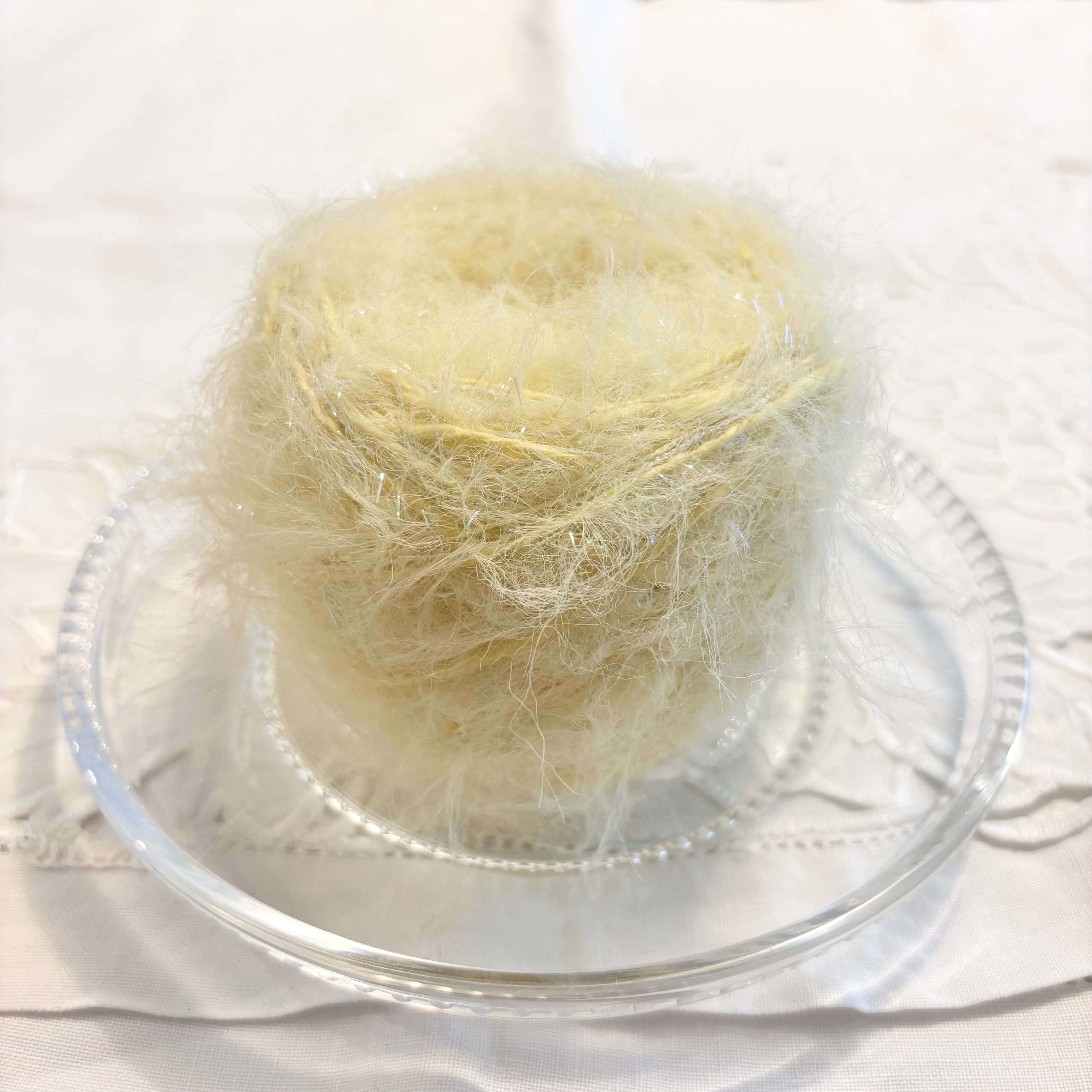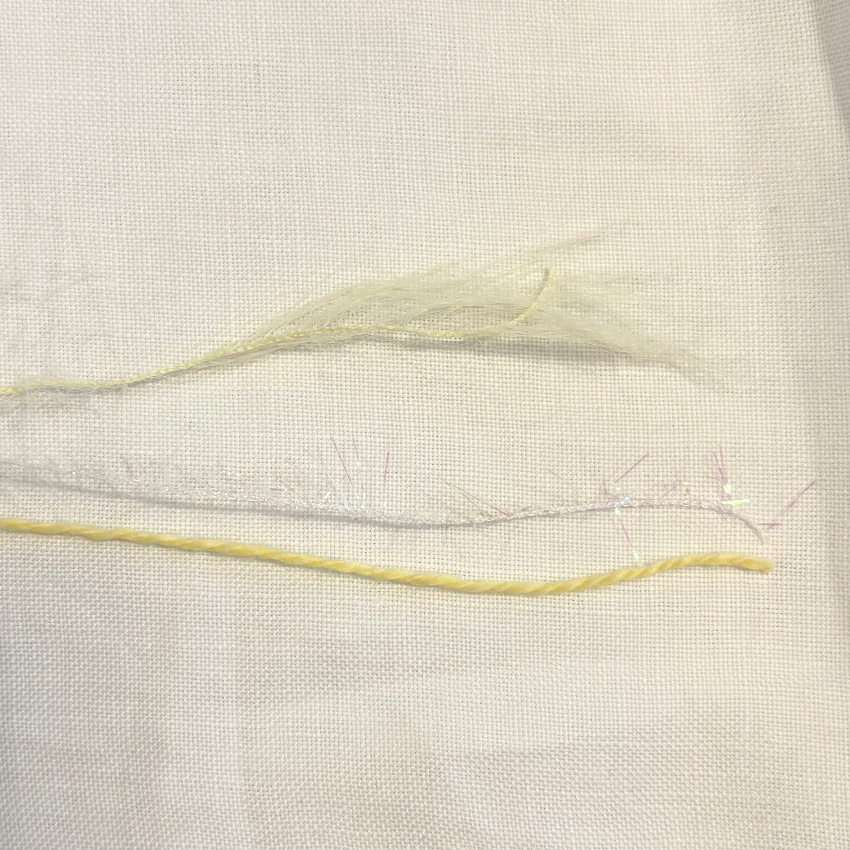 オーロラのキラキラヤーン、イエローのファーヤーン、イエローのコットンヤーンの計3本を引き揃えてます♪